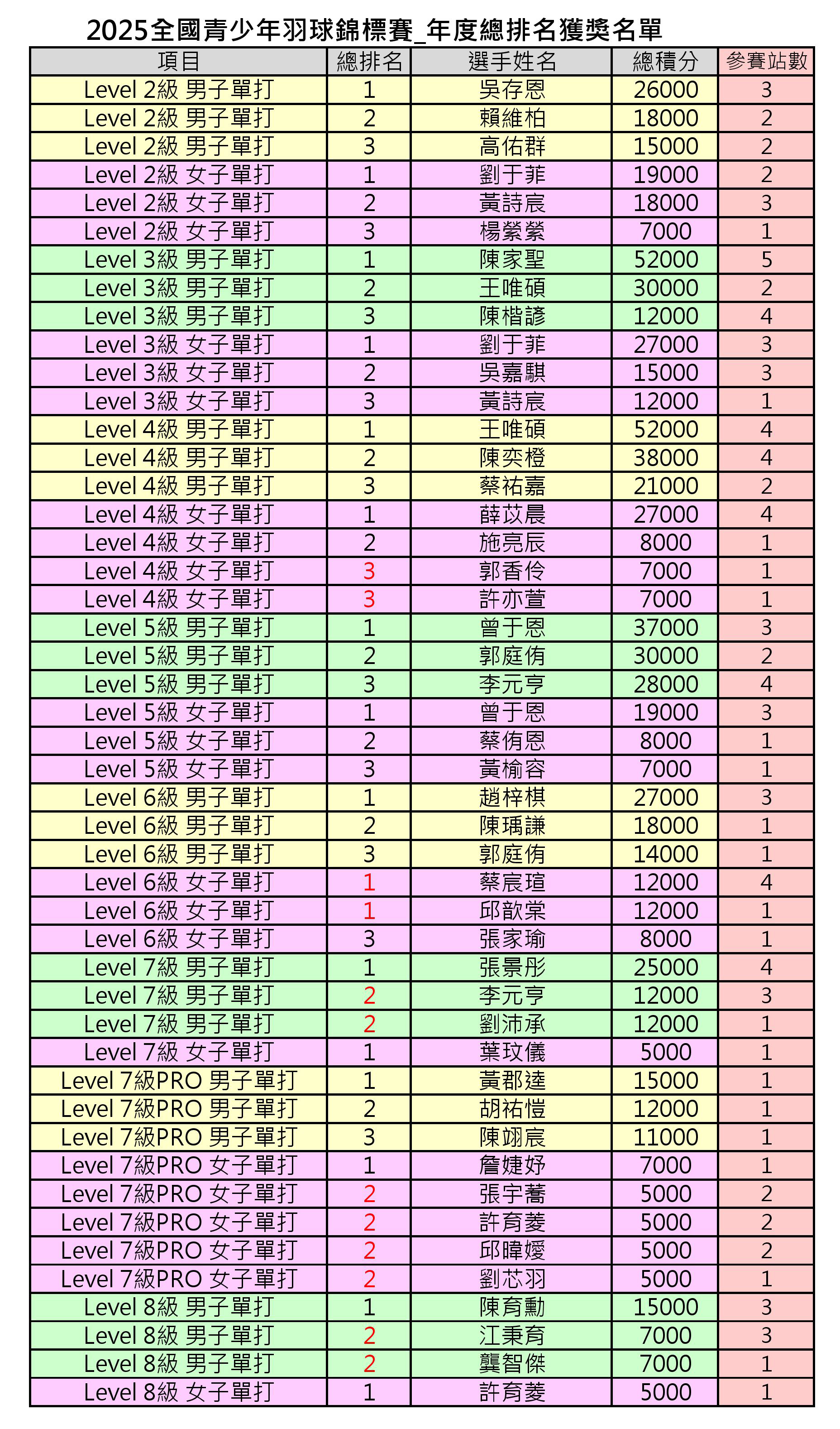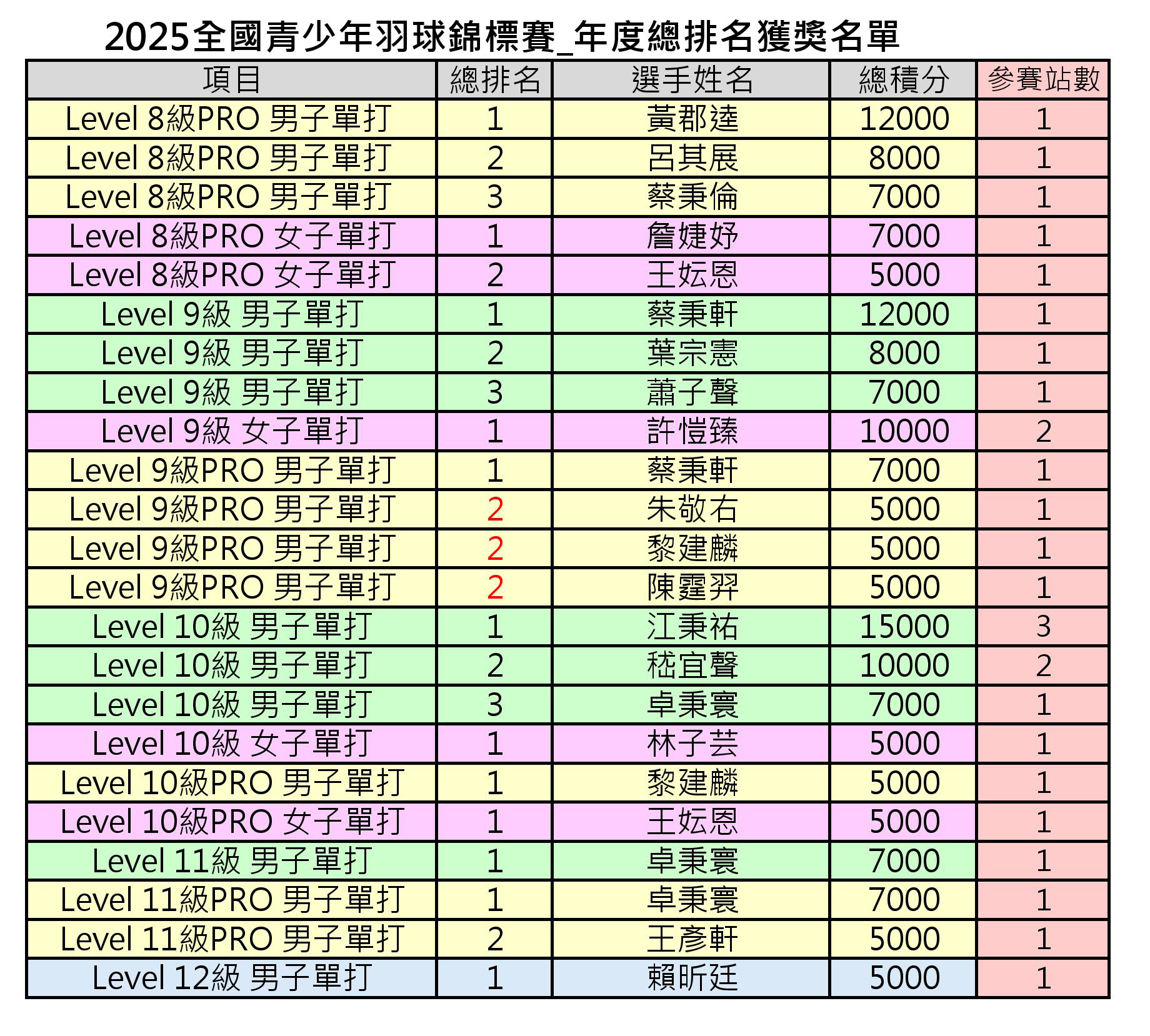 2025全國青少年羽球錦標賽年度總排名頒獎名單