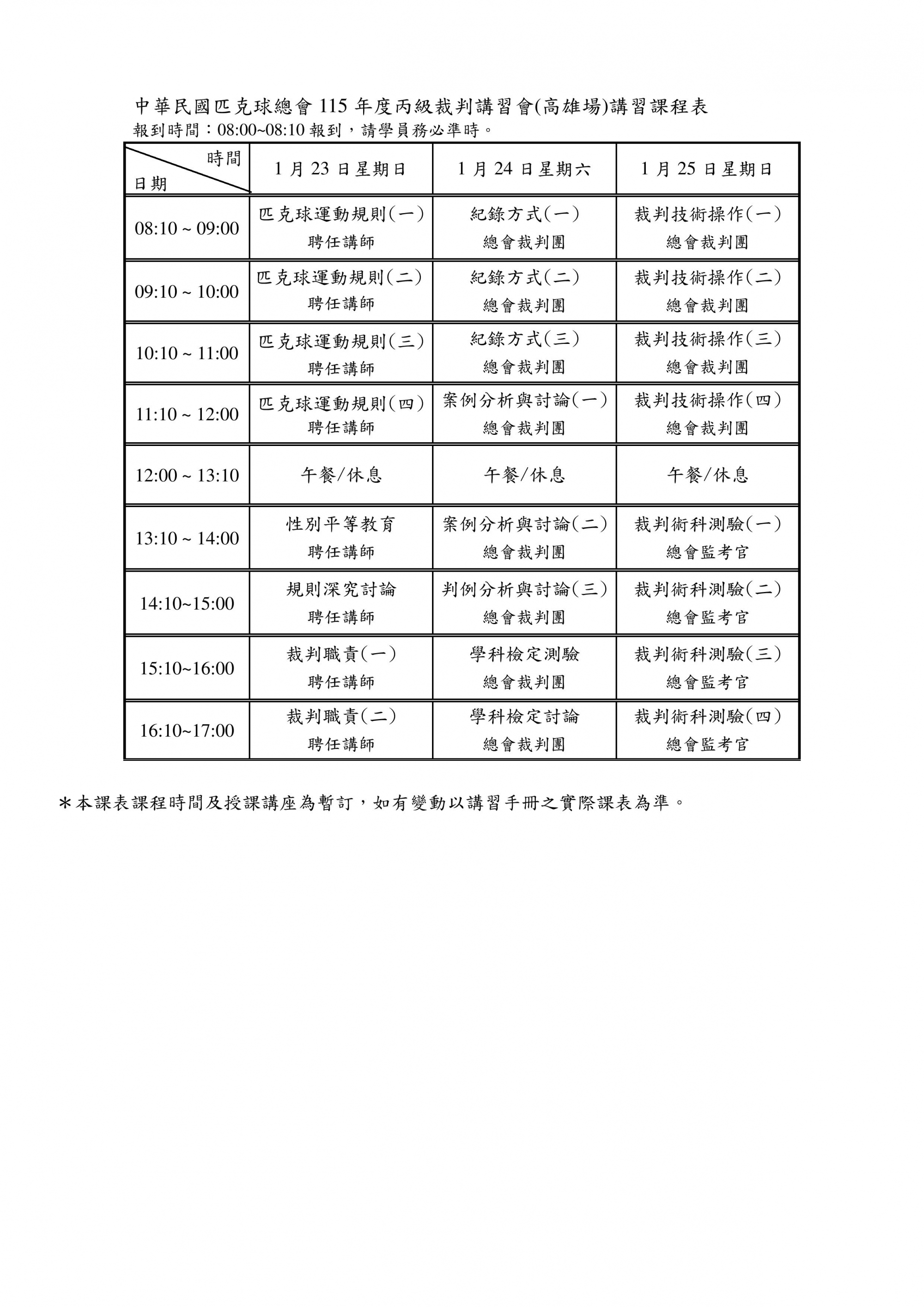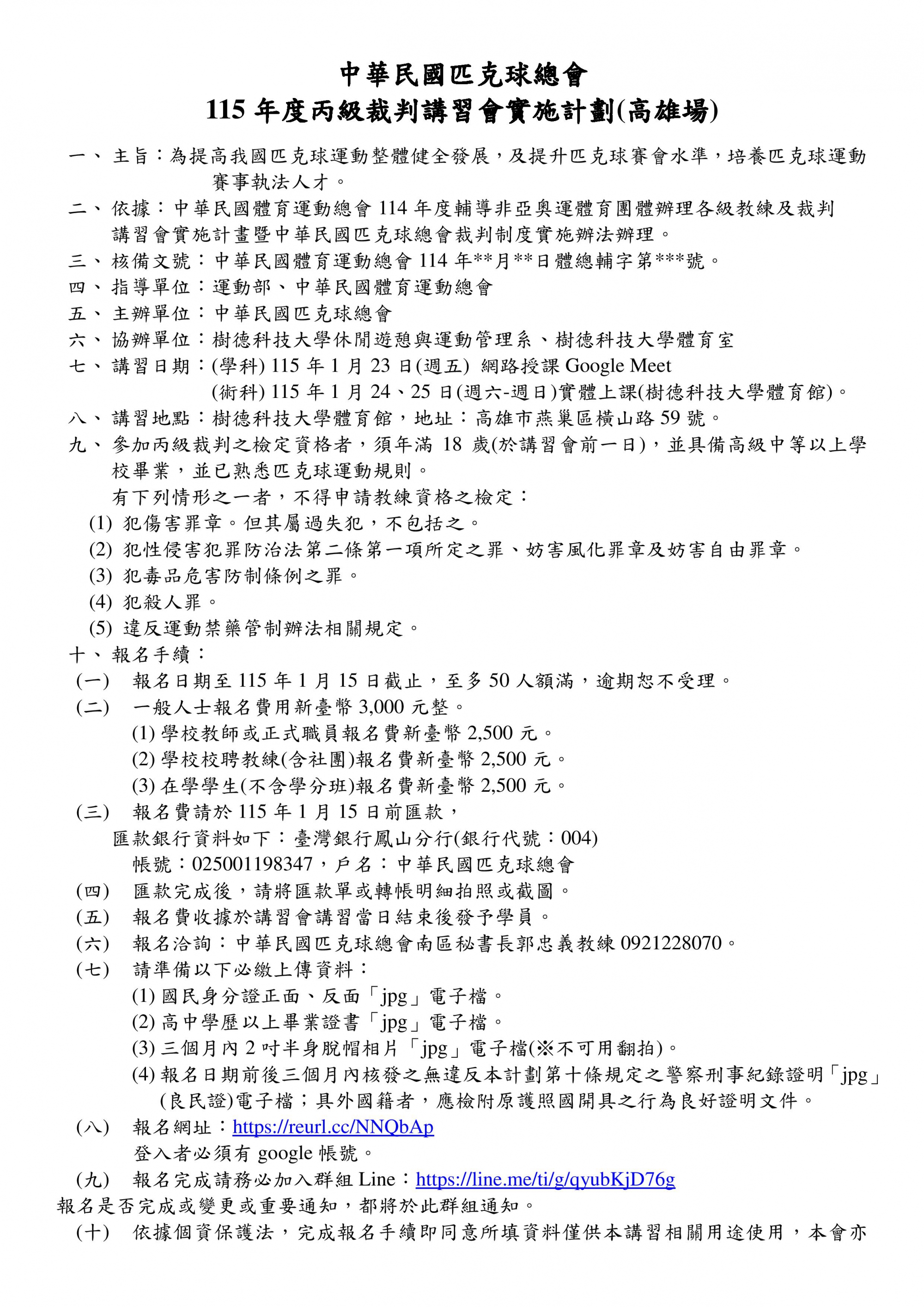 115年度丙級匹克球裁判講習會(高雄場)-01/23-25 開始報名嘍