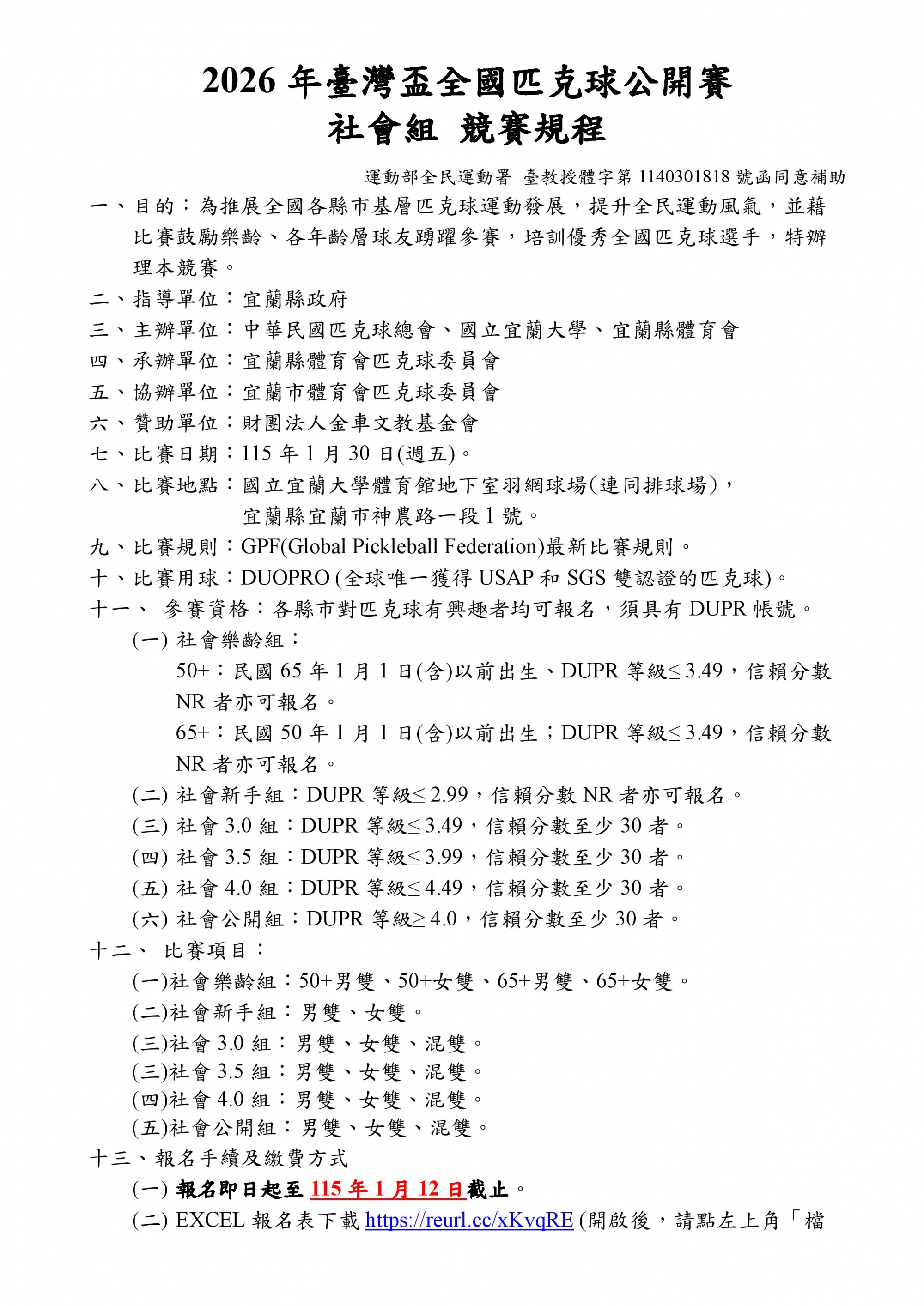 2026年臺灣盃全國匹克球公開賽(社會組)開始報名嘍