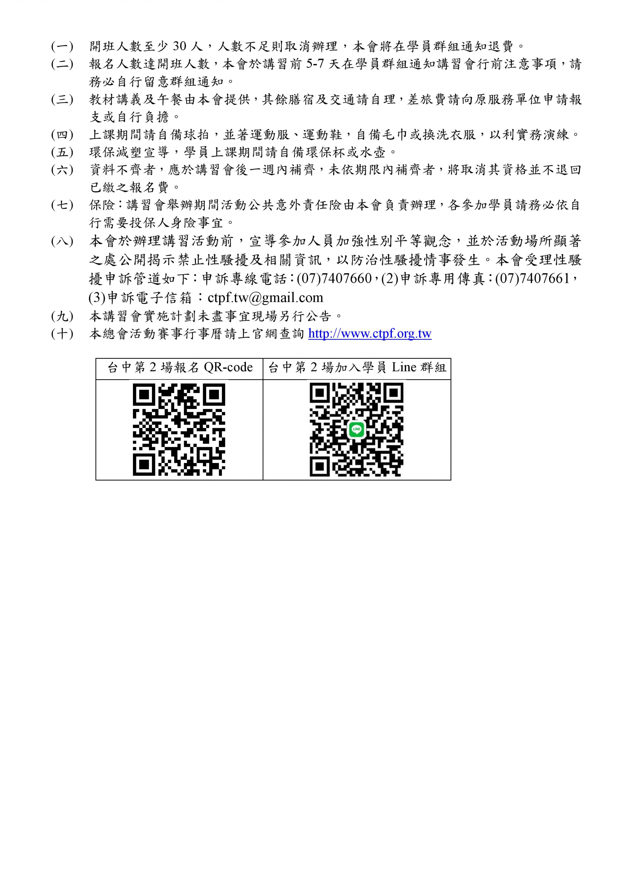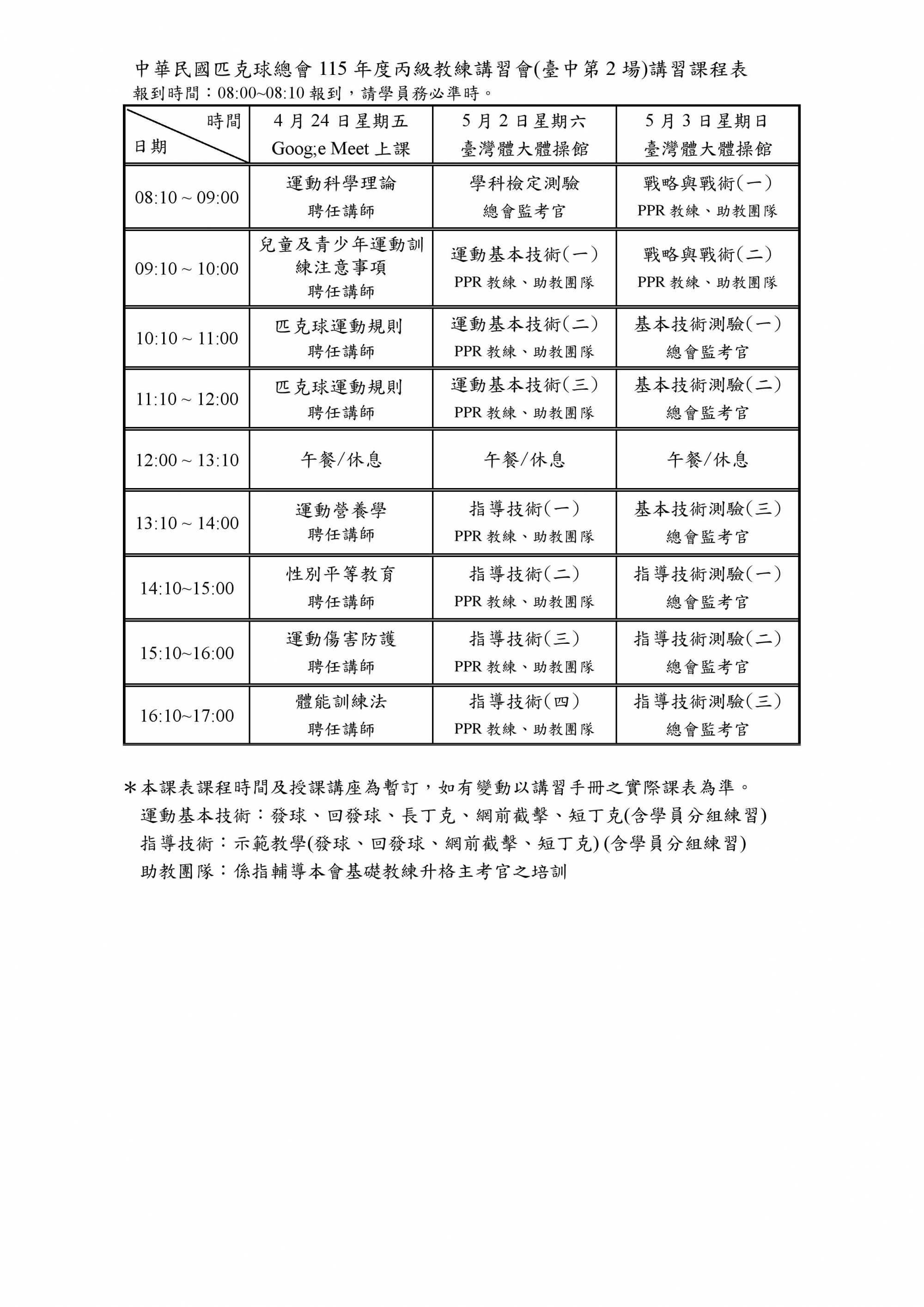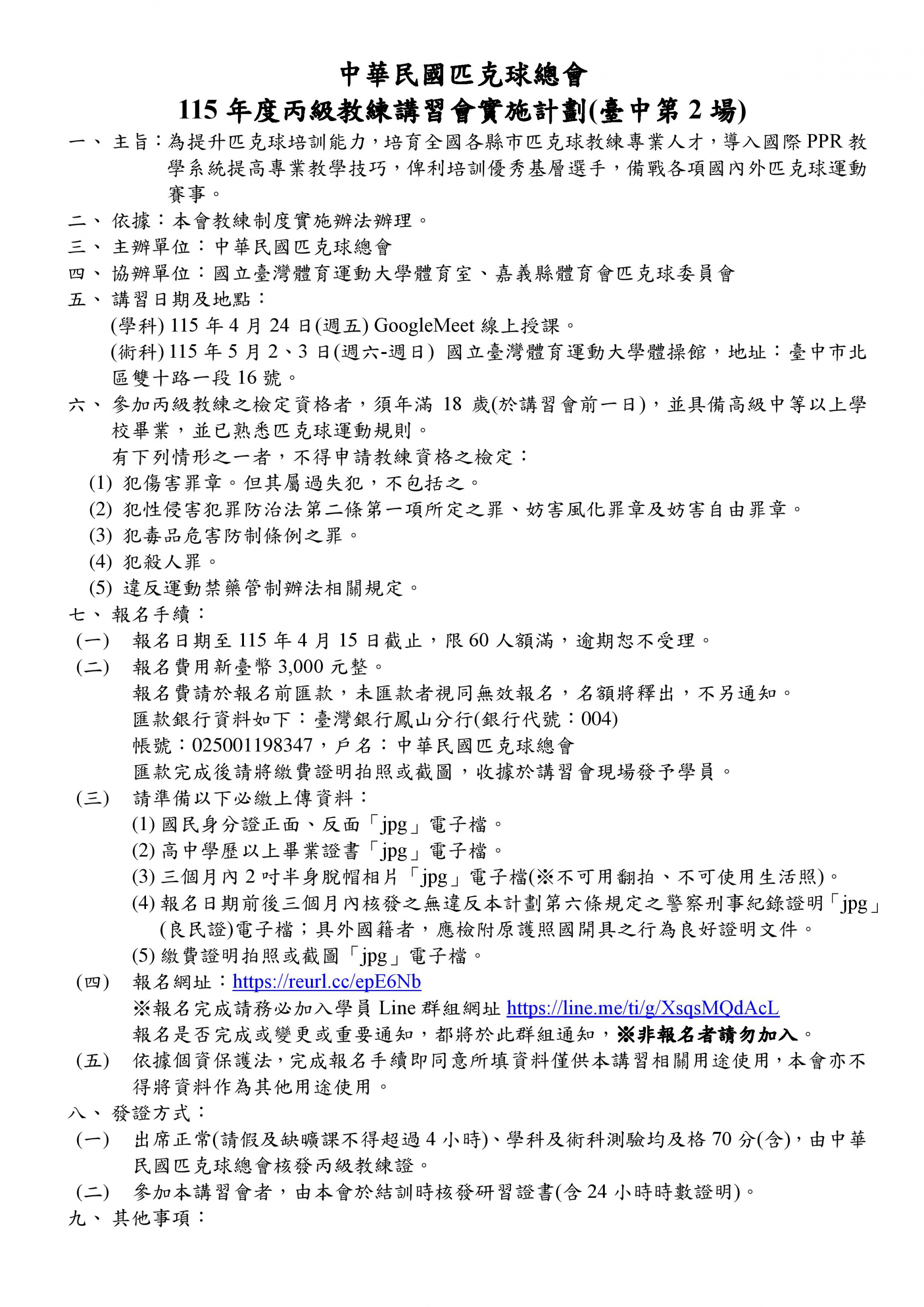 115年度丙級匹克球教練講習會(臺中第2場)開始報名名額限60人