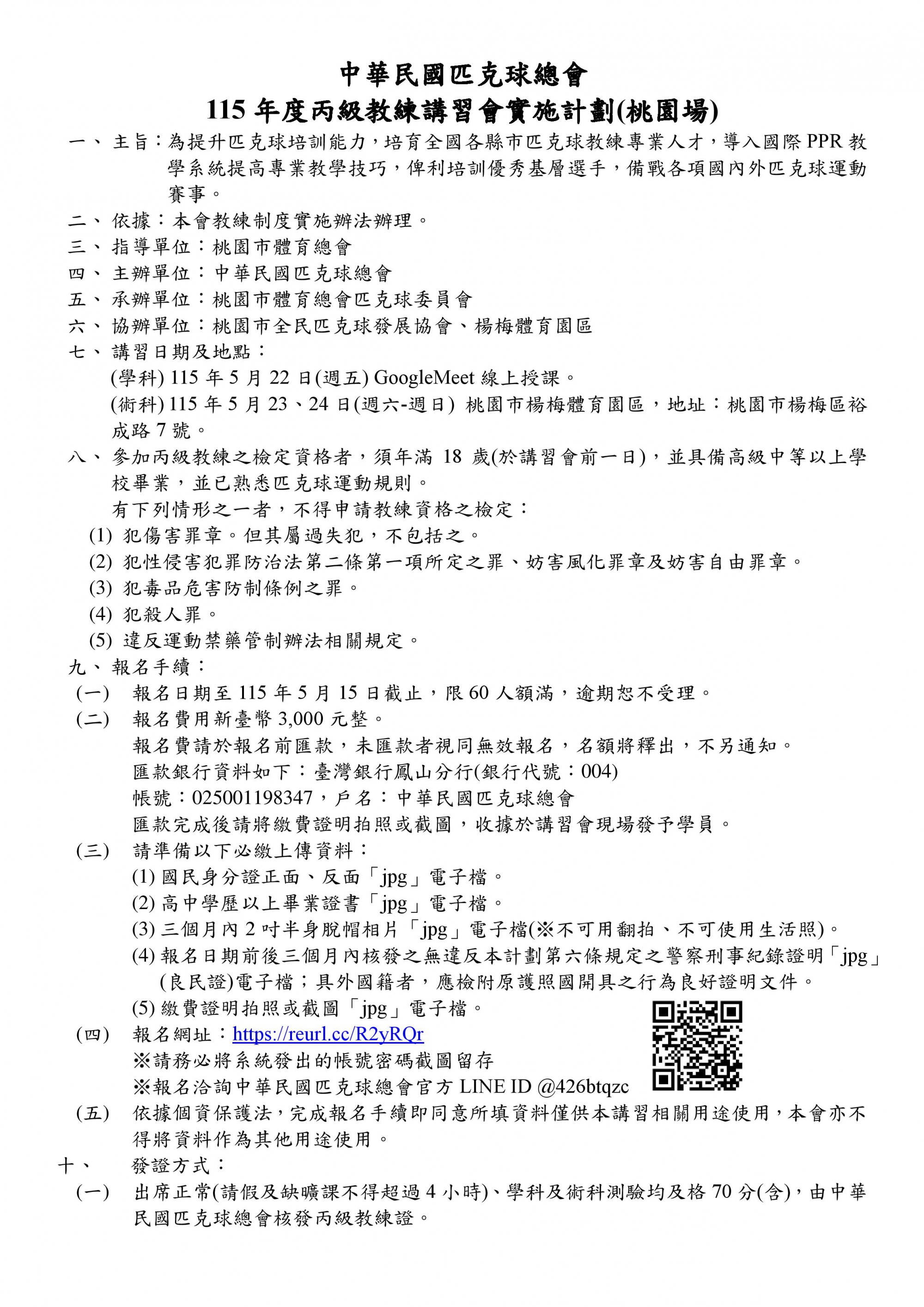 115年度丙級匹克球教練講習會(桃園場)開始報名