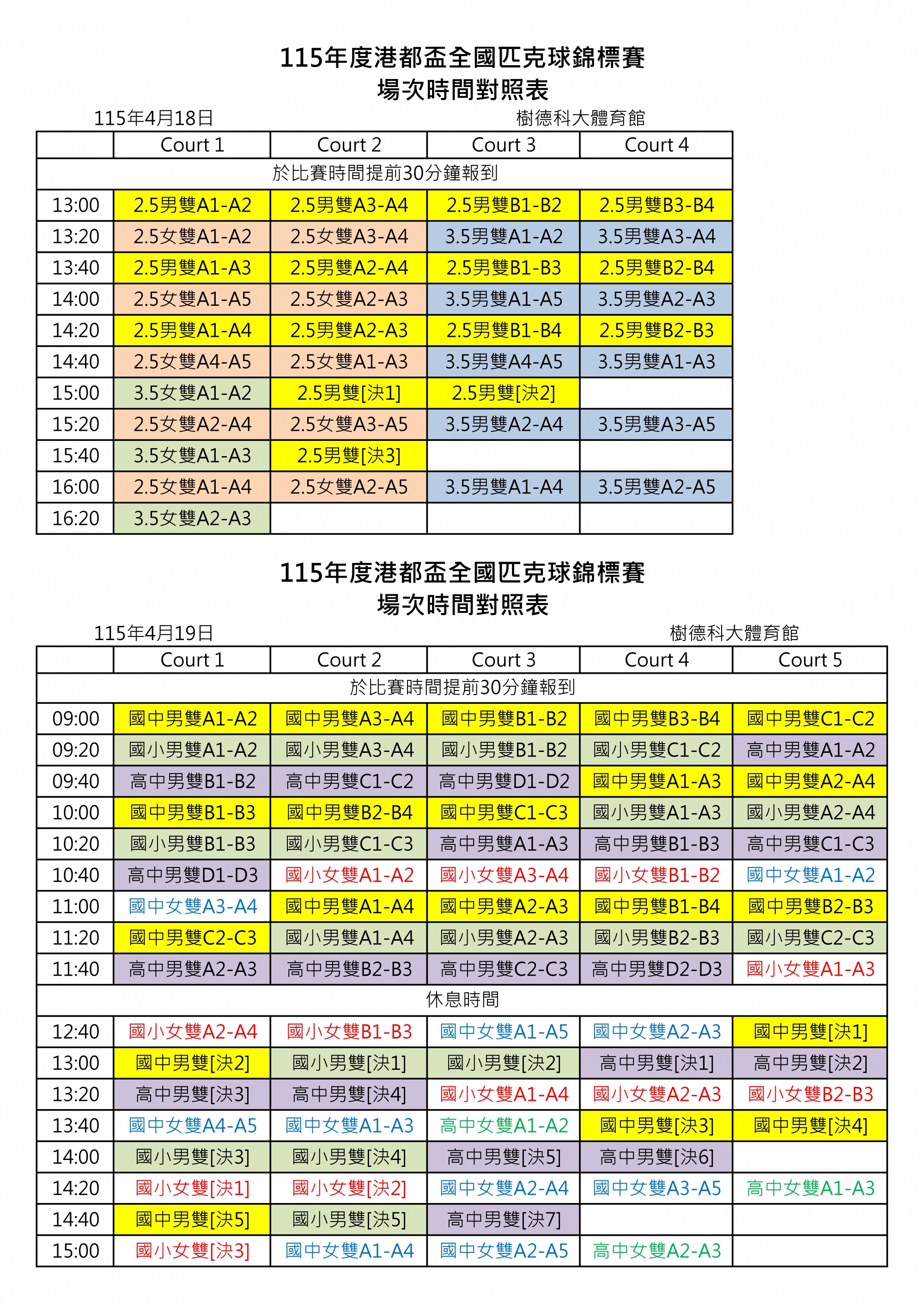 請選手於比賽時間提前30分鐘報到