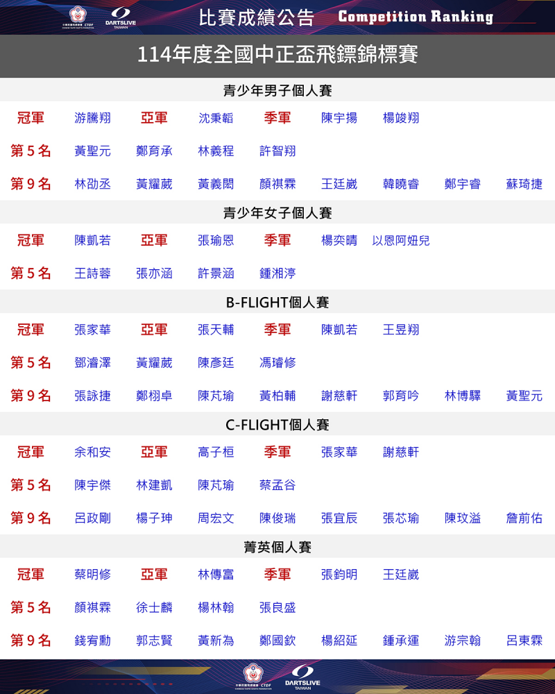 114年度全國中正盃飛鏢錦標賽