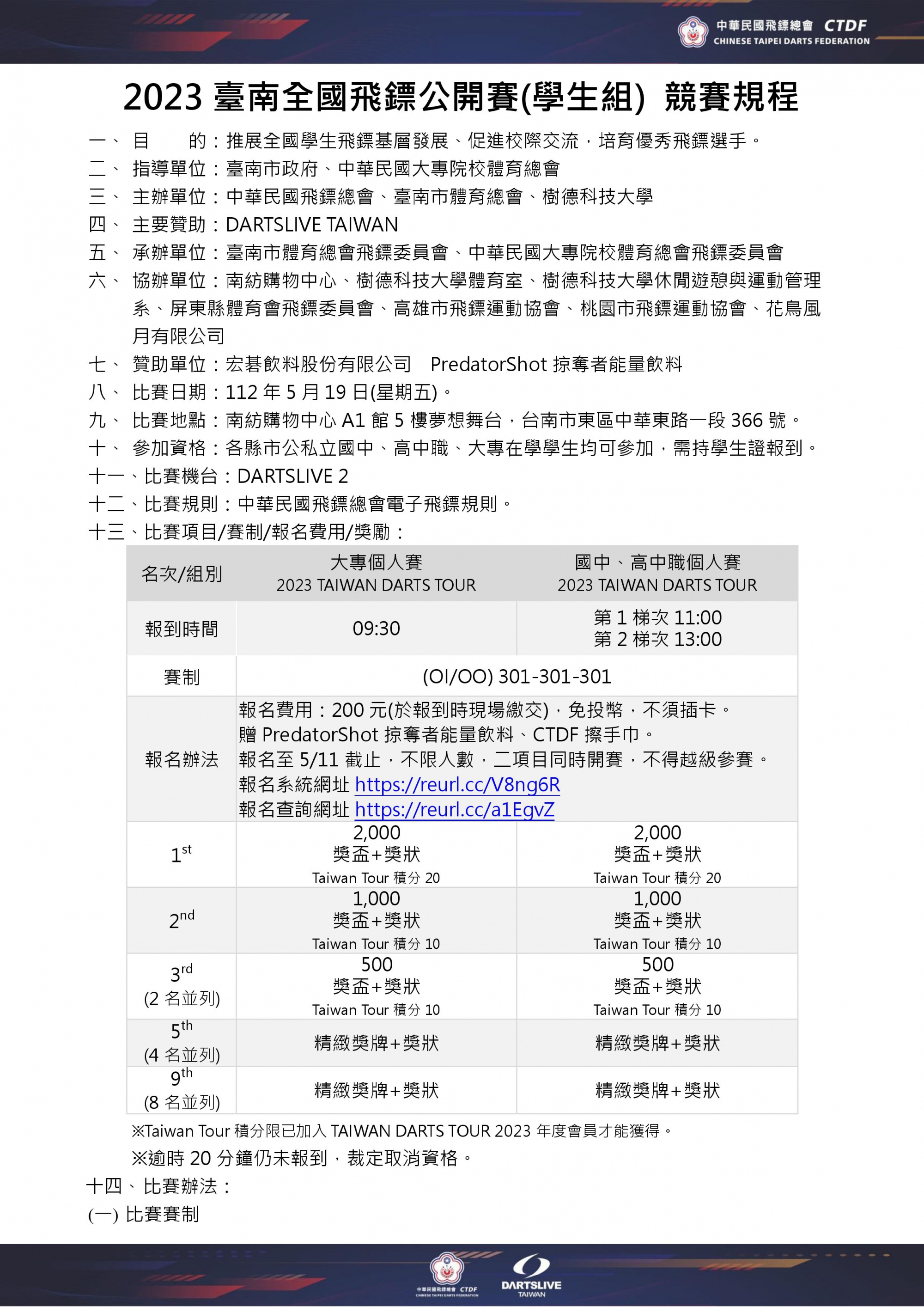 2023臺南全國飛鏢公開賽(學生組) 競賽規程公告