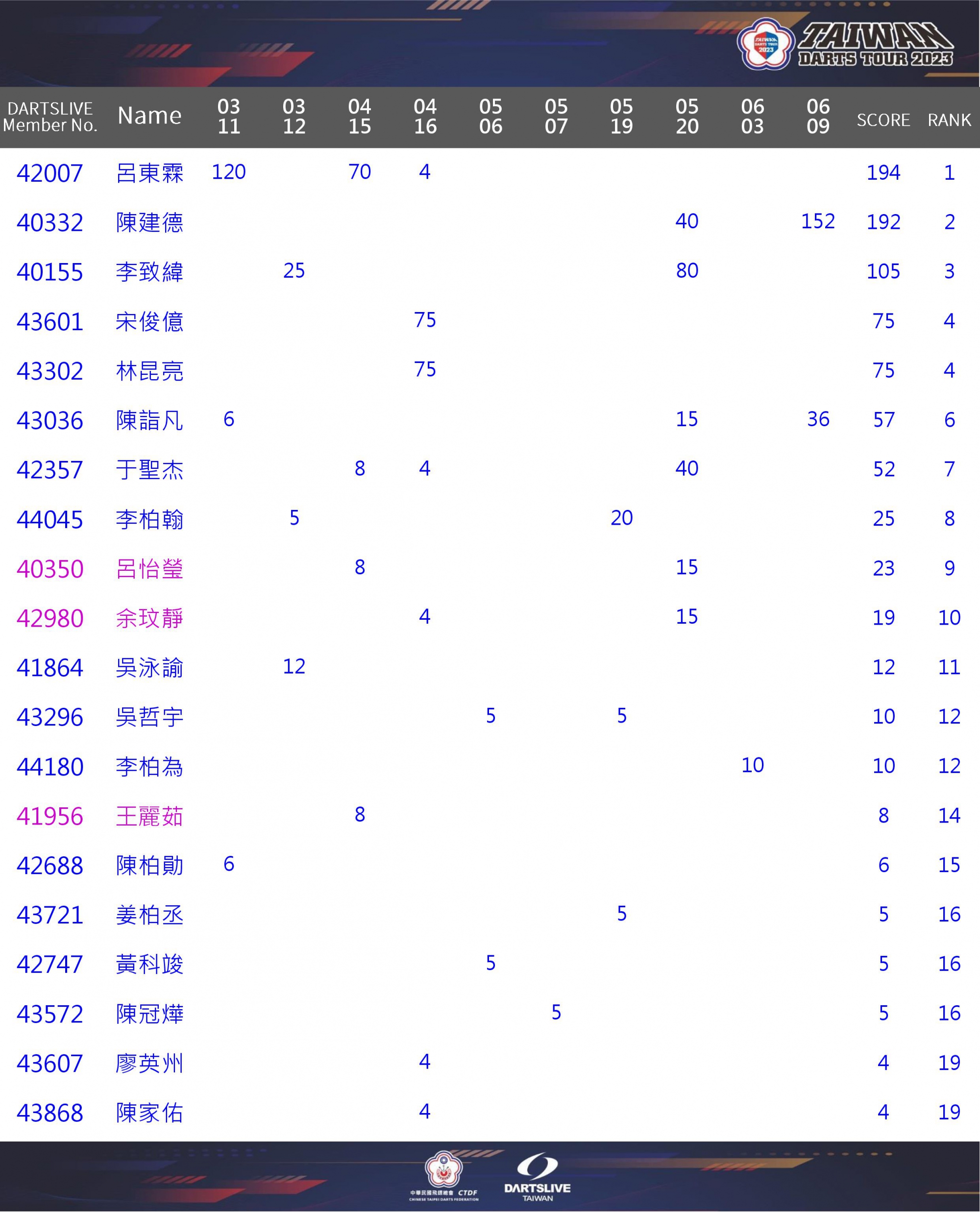 2023Taiwan Darts Tour台灣飛鏢巡迴賽積分排名公告
