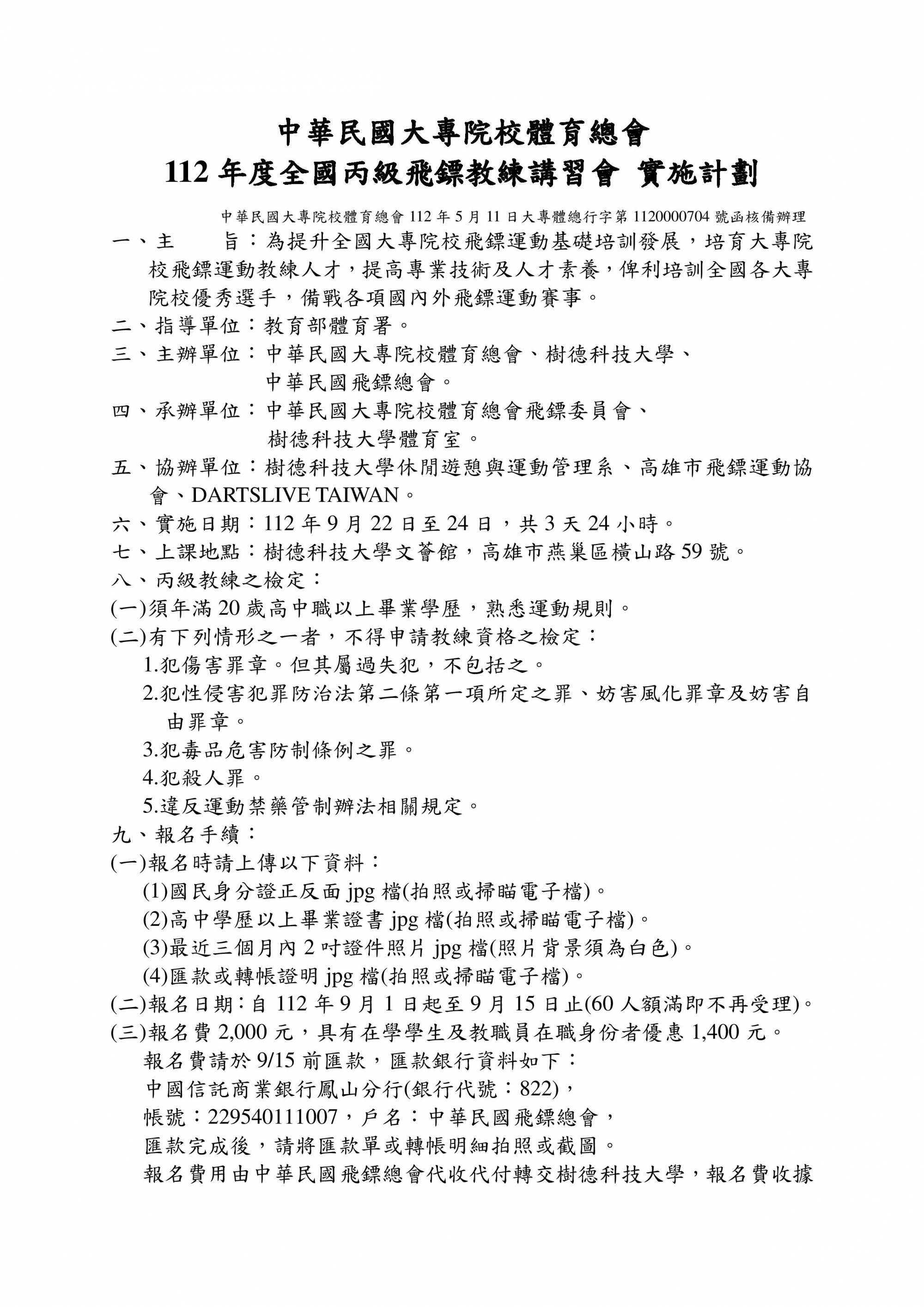 三、主辦單位:中華民國大專院校體育總會、樹德科技大學、中華民國飛鏢總會。