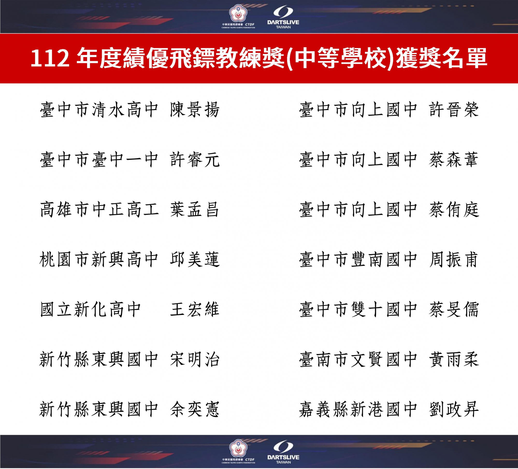112年度績優飛鏢教練獎(中等學校)獲獎名單