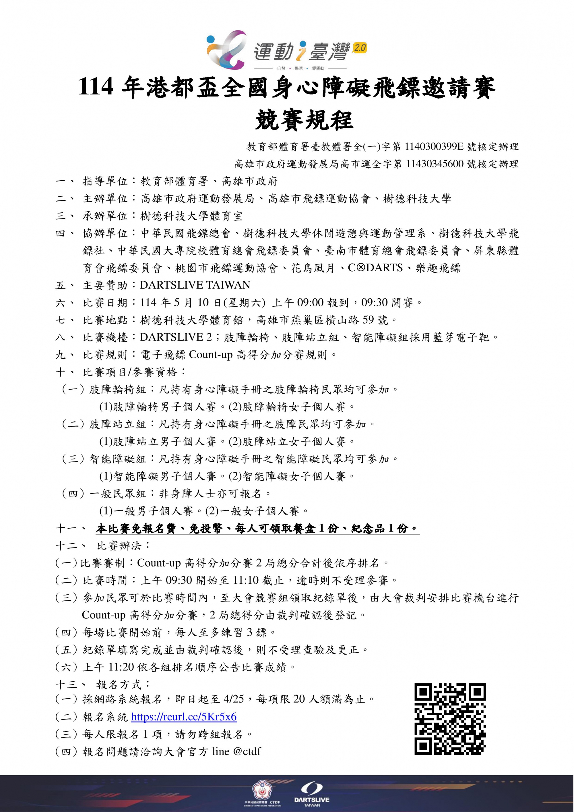 運動i台灣2.0-114年港都盃全國身心障礙飛鏢邀請賽免報名費一般民眾亦可報名餐加