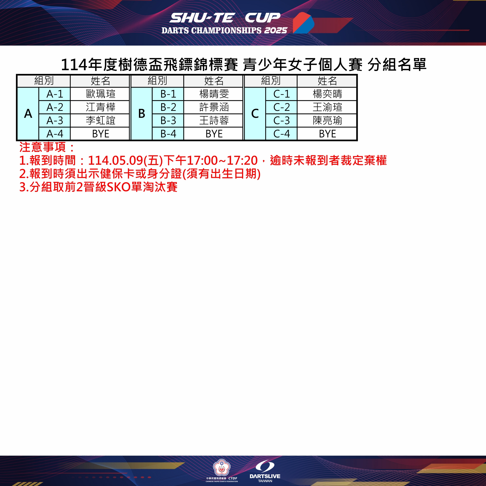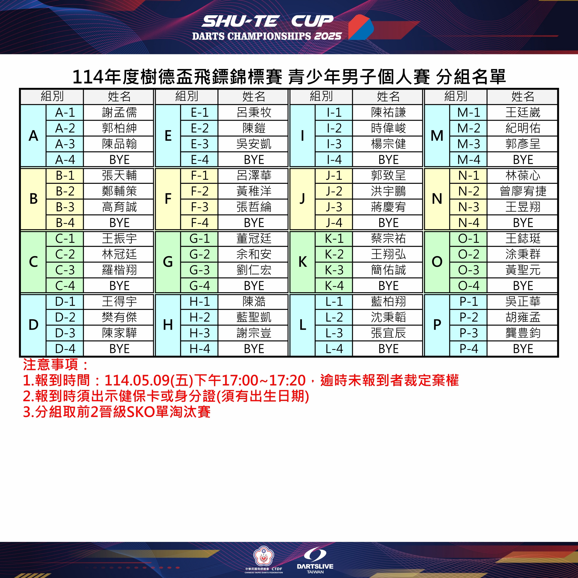 114年度樹德盃飛鏢錦標賽分組名單及報到時間公告