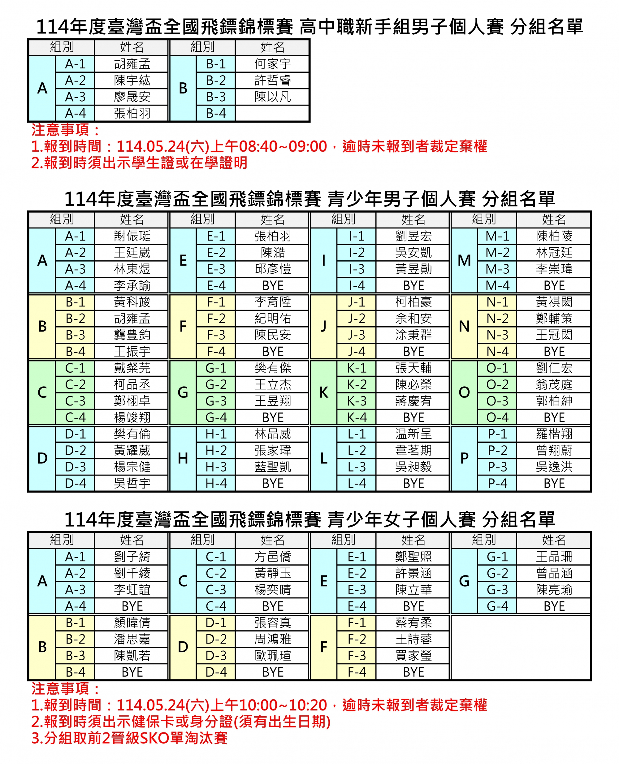 114年度臺灣盃全國飛鏢錦標賽分組名單及報到時間公告