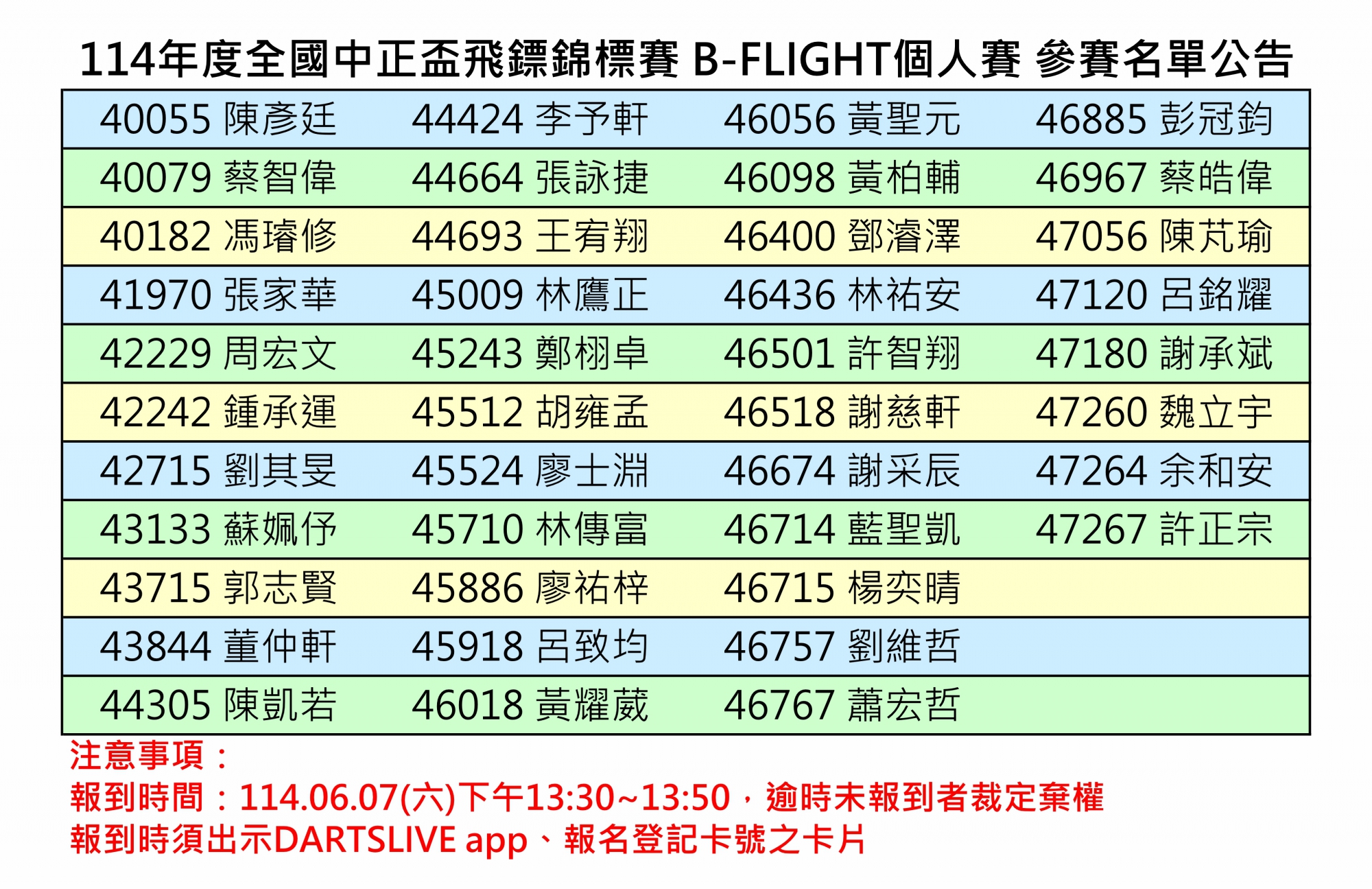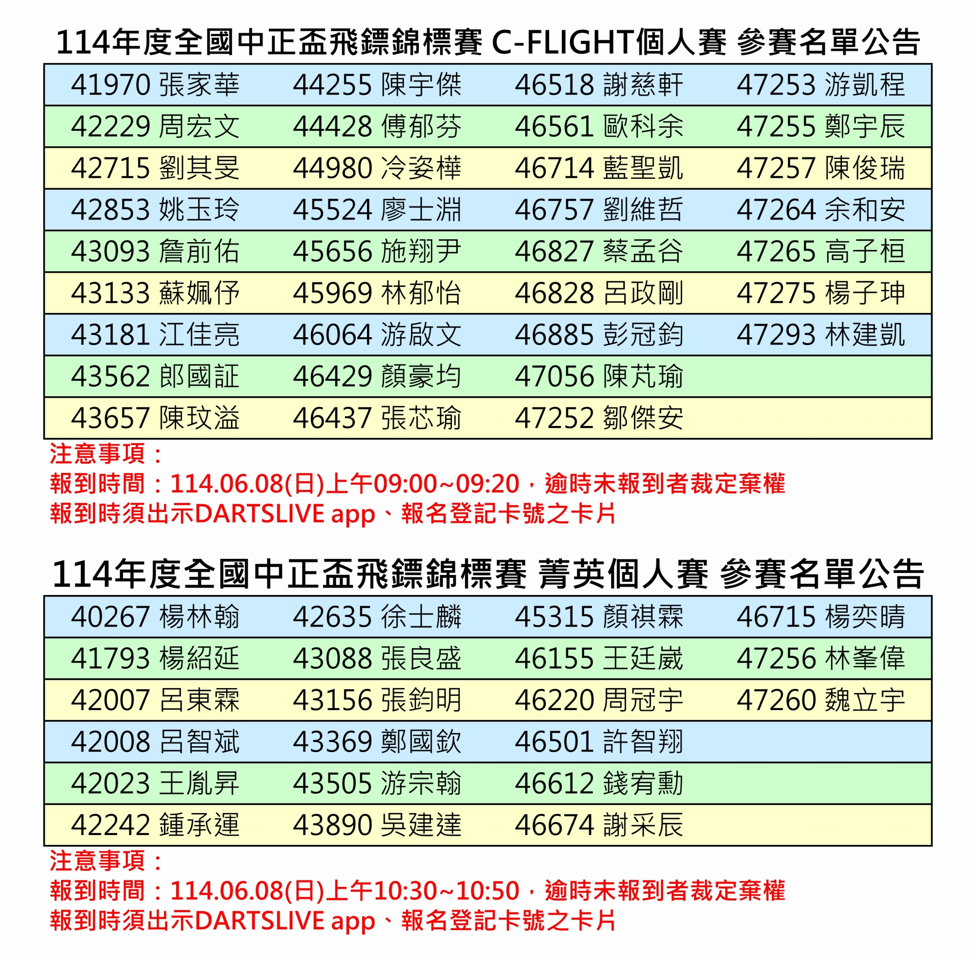114年度全國中正盃飛鏢錦標賽分組名單及報到時間公告