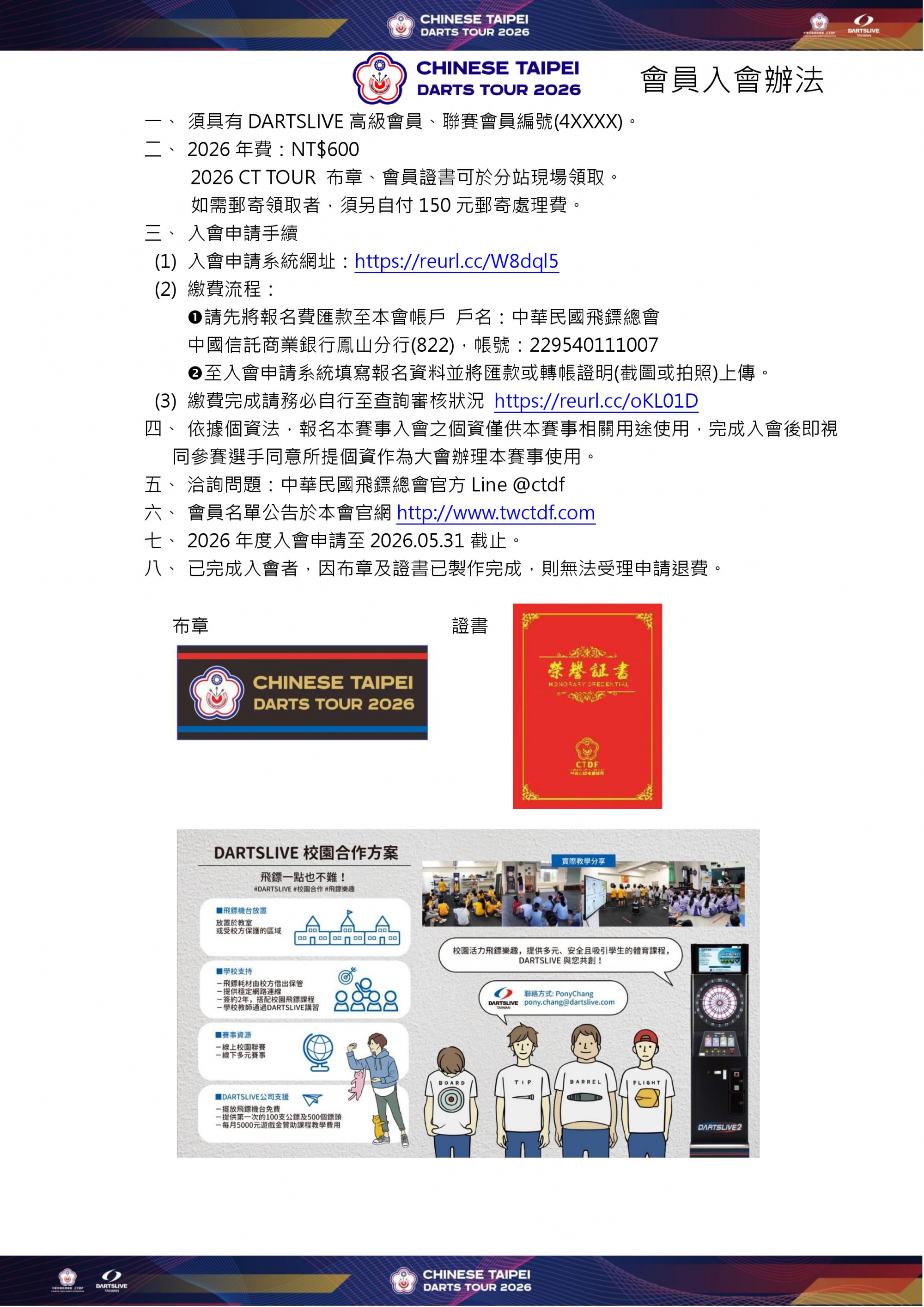 CHINESE TAIPEI DARTS TOUR 2026 賽事概要公告
