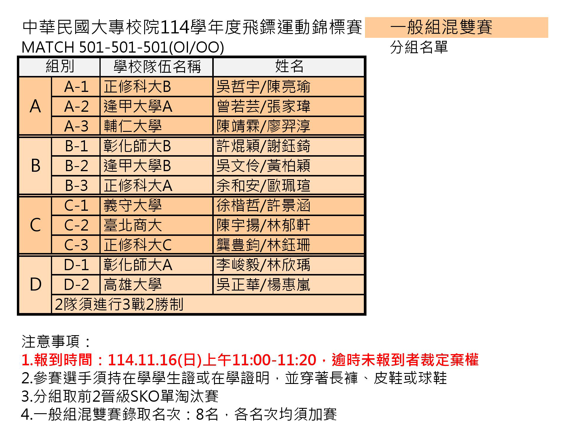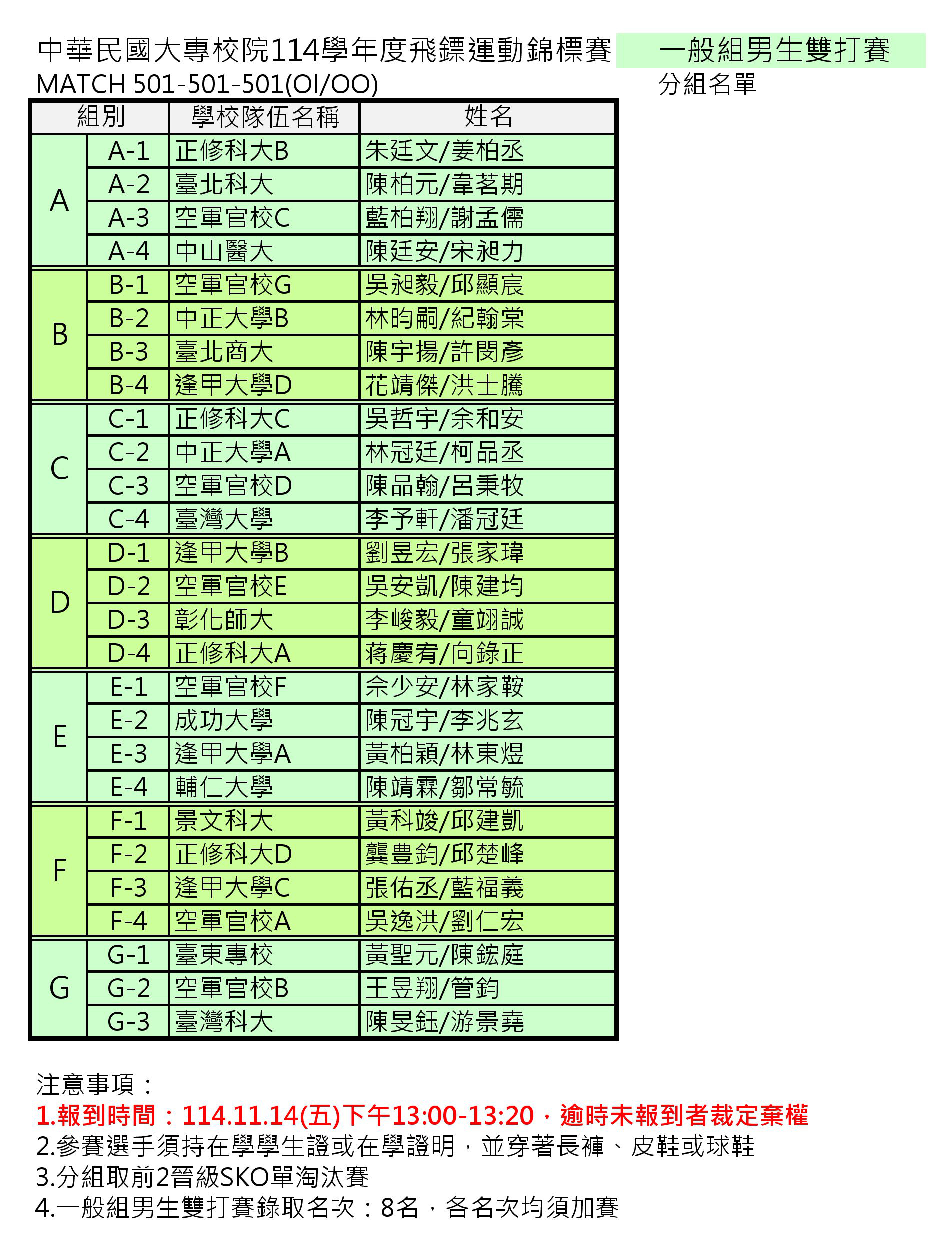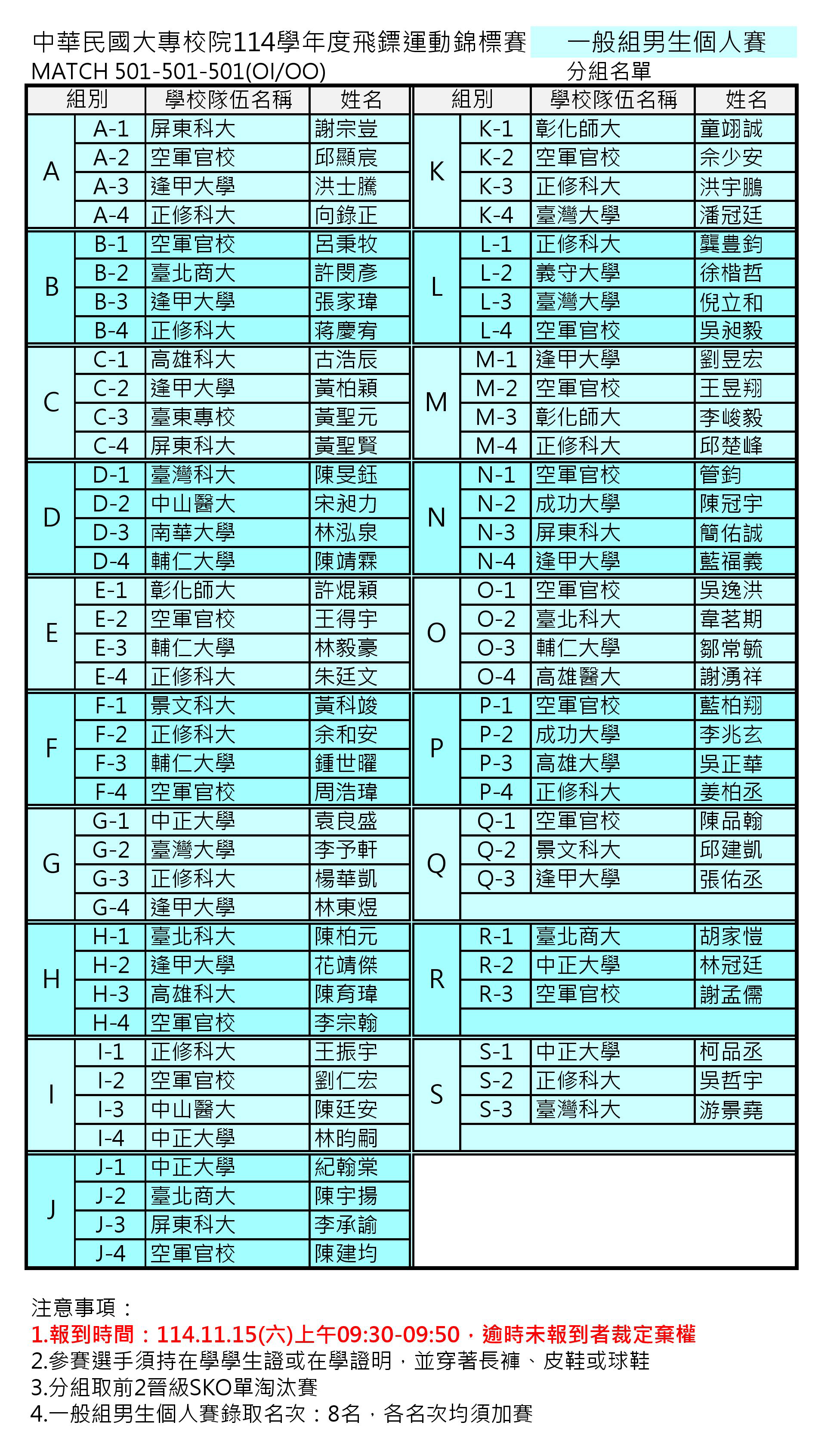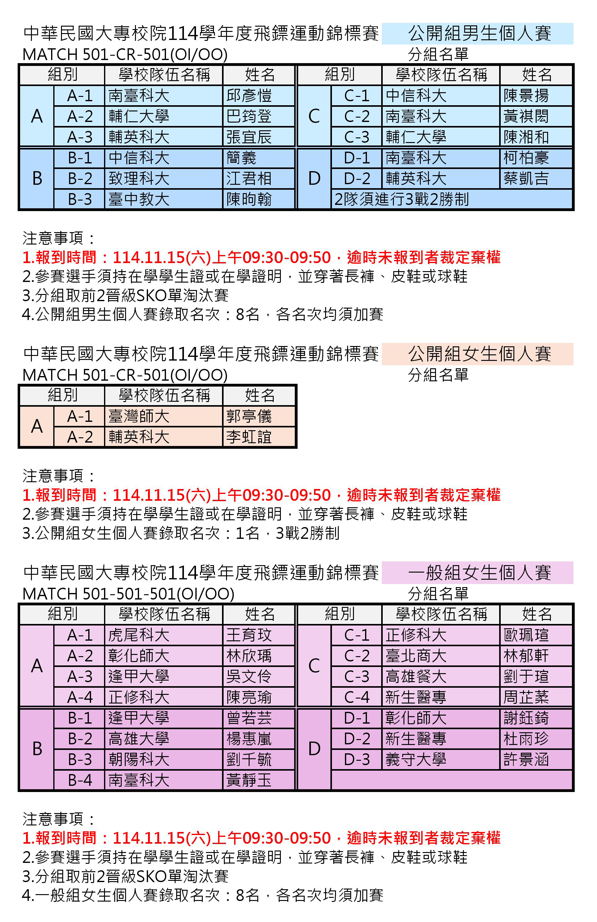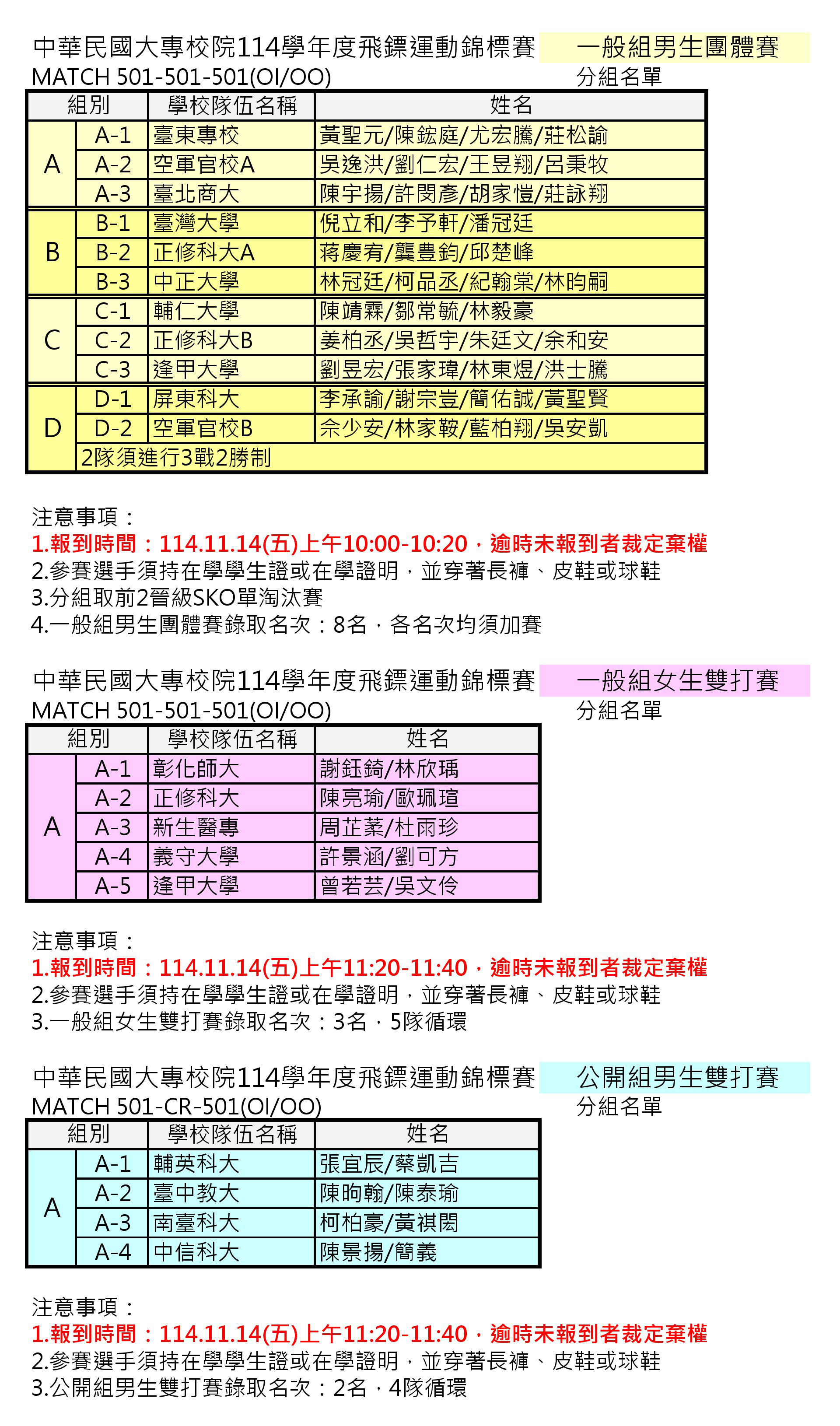中華民國大專校院114學年度飛鏢運動錦標賽 分組名單賽程及報到時間公告
