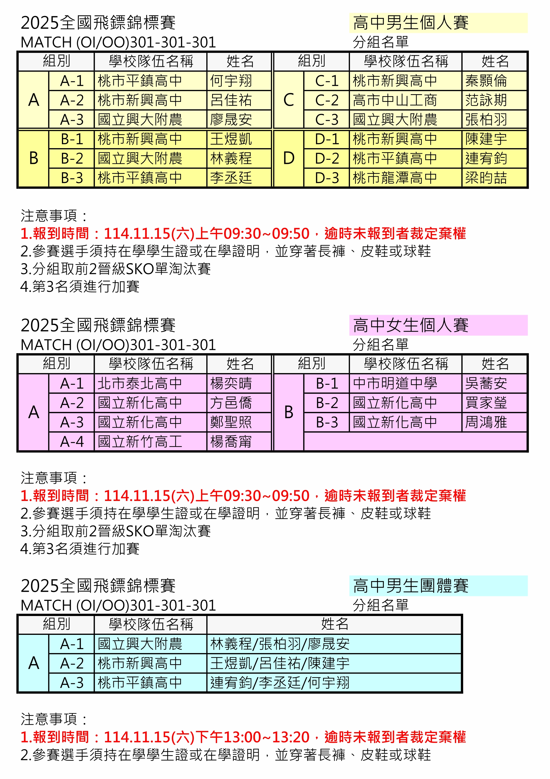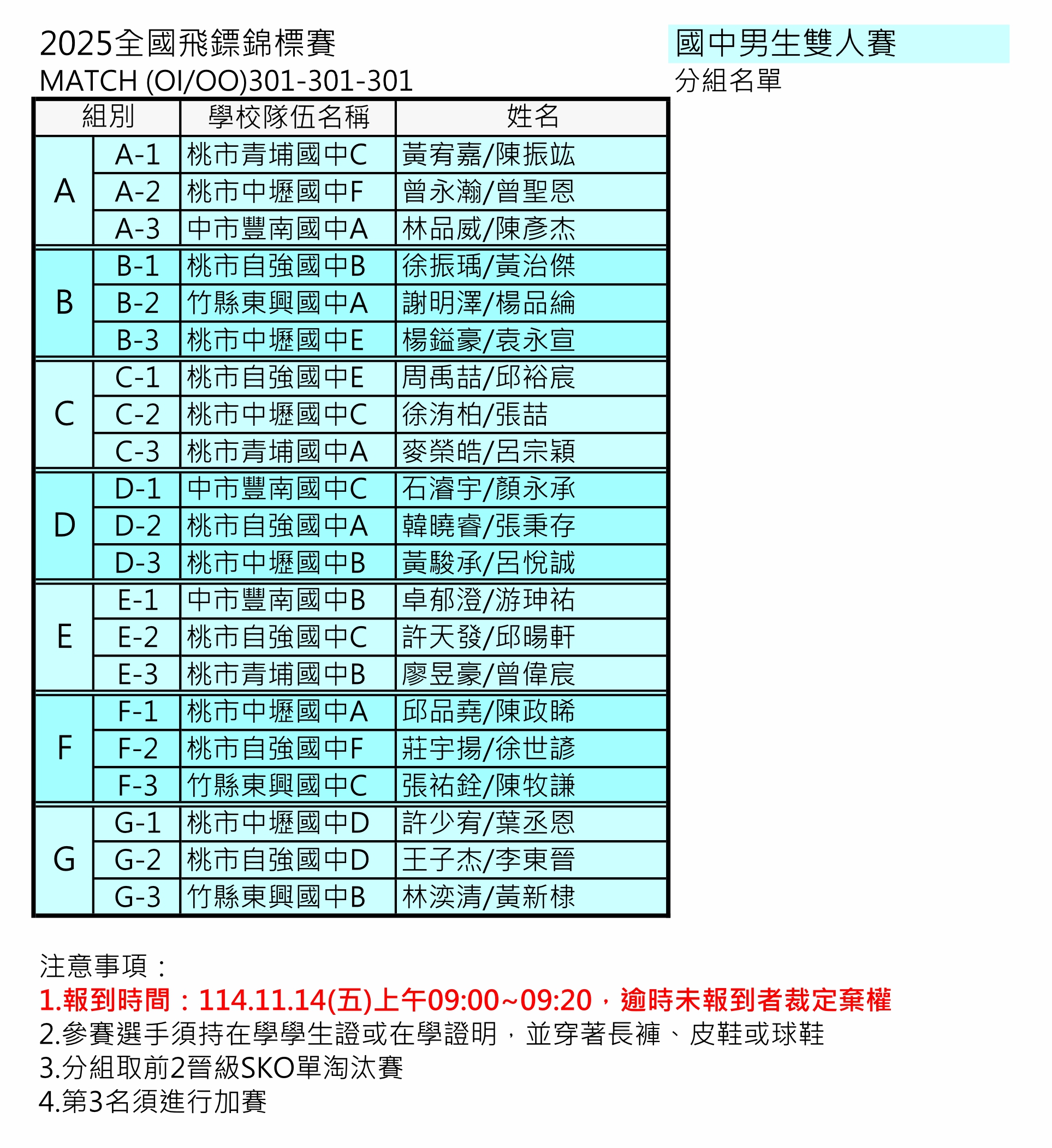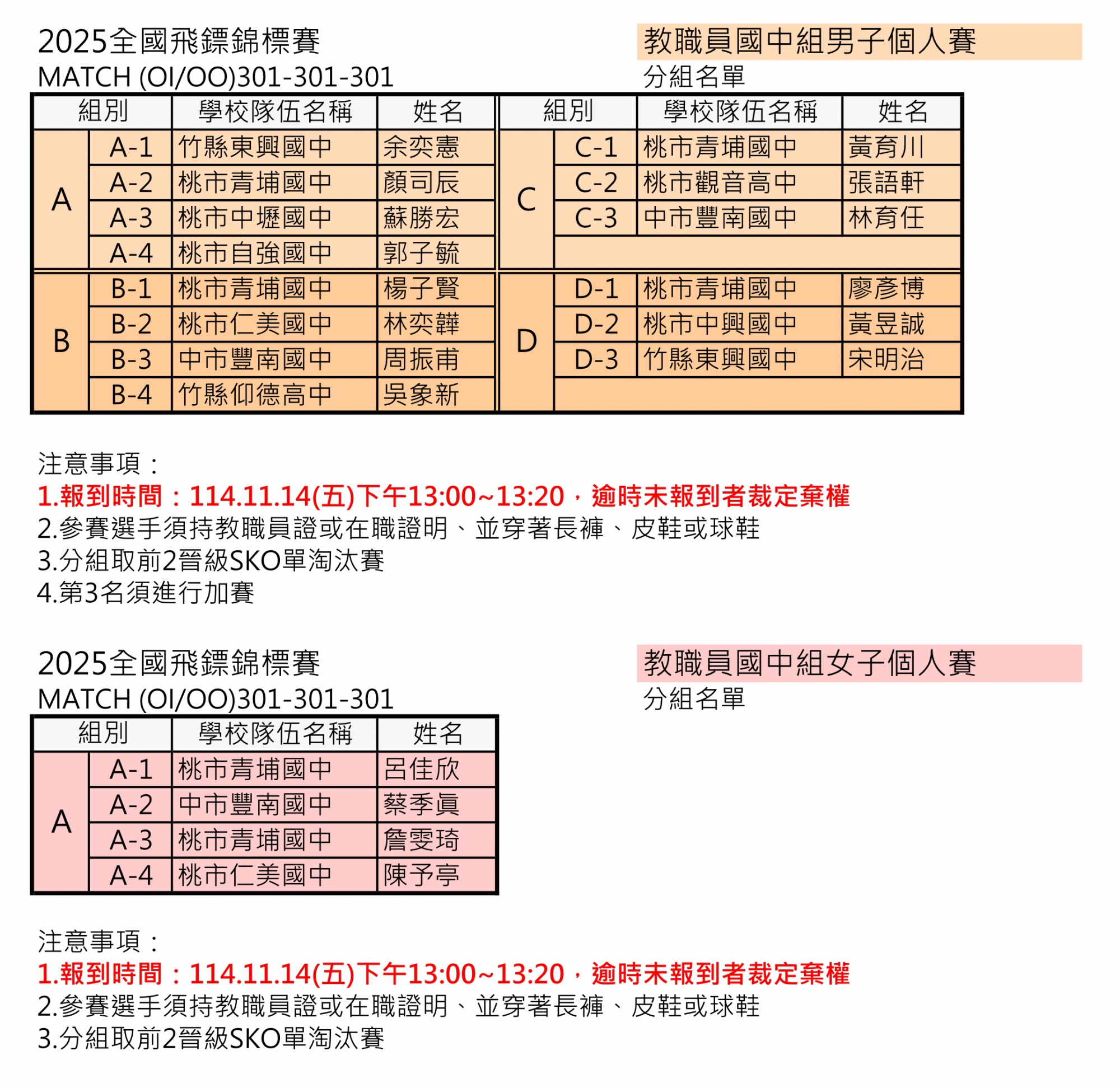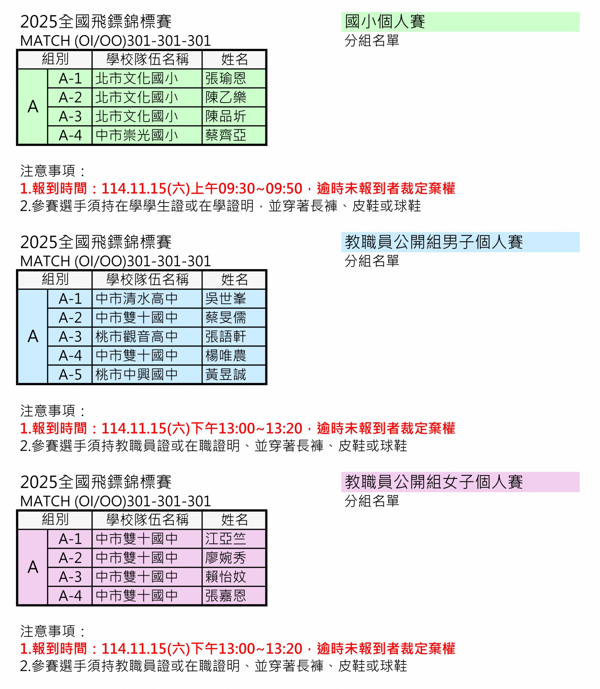學生組、教職員組 分組名單賽程及報到時間公告