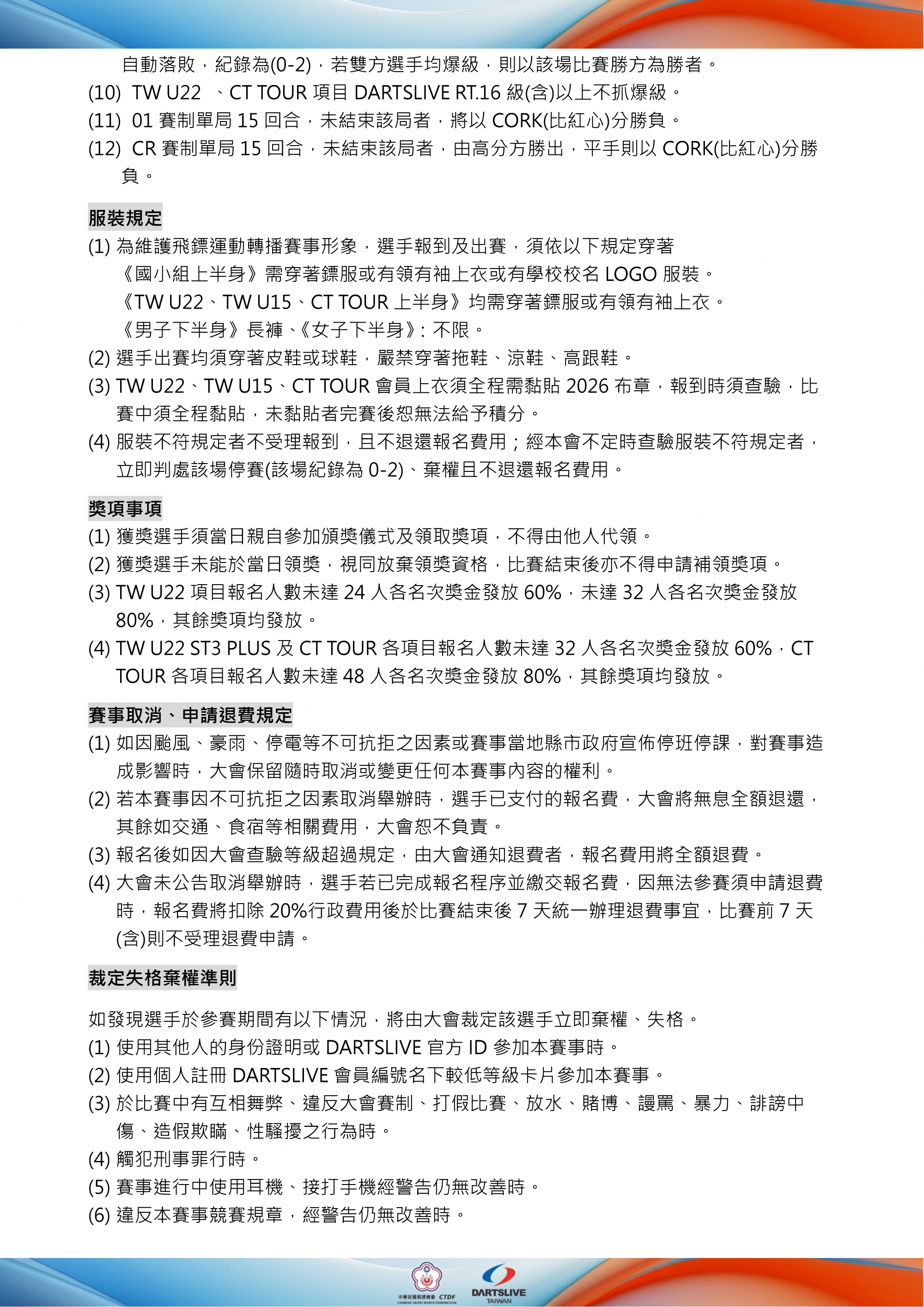 (八)TW U22 OPEN、TW U15、TW U22 LADIES項目需達16人開賽,TW U22 OPEN ST3 PLUS、CT TOUR ST3-4項目需達24人開賽,未達人數則取消項目,無息退費。
