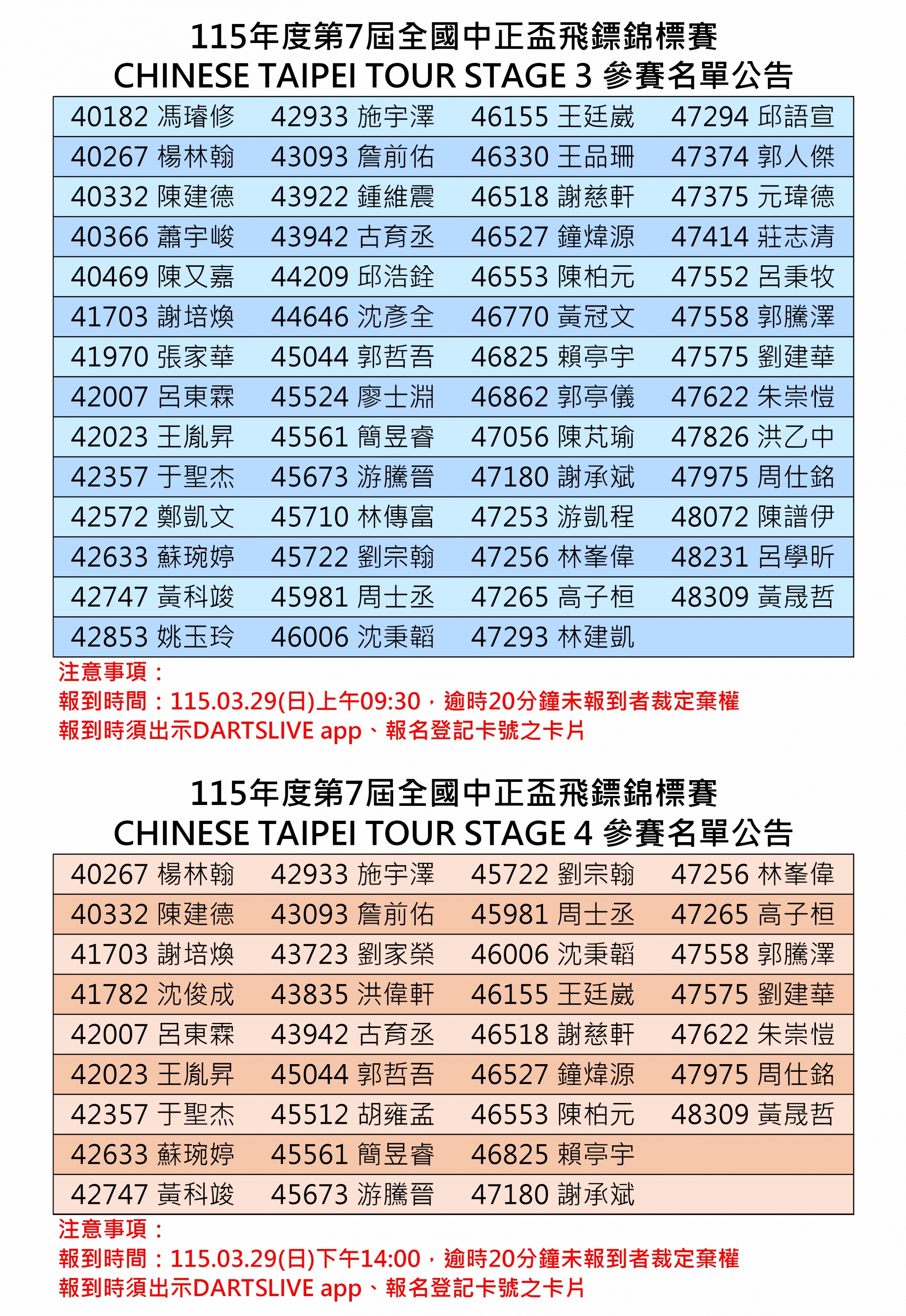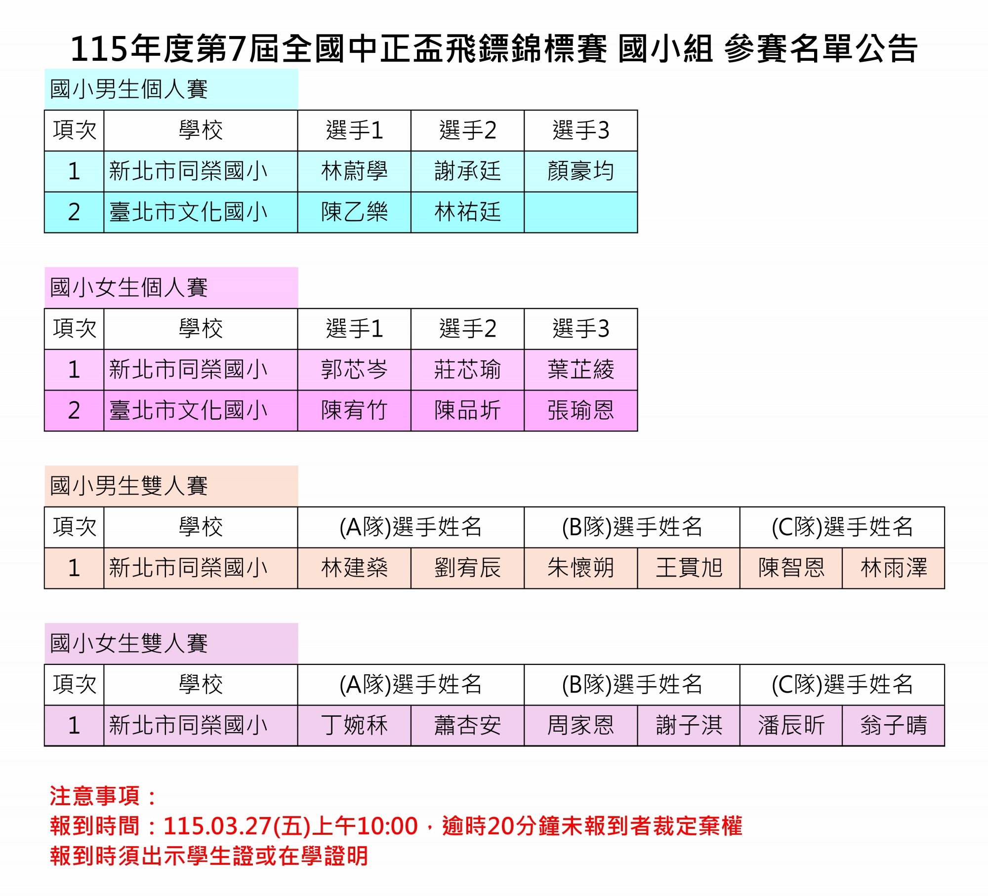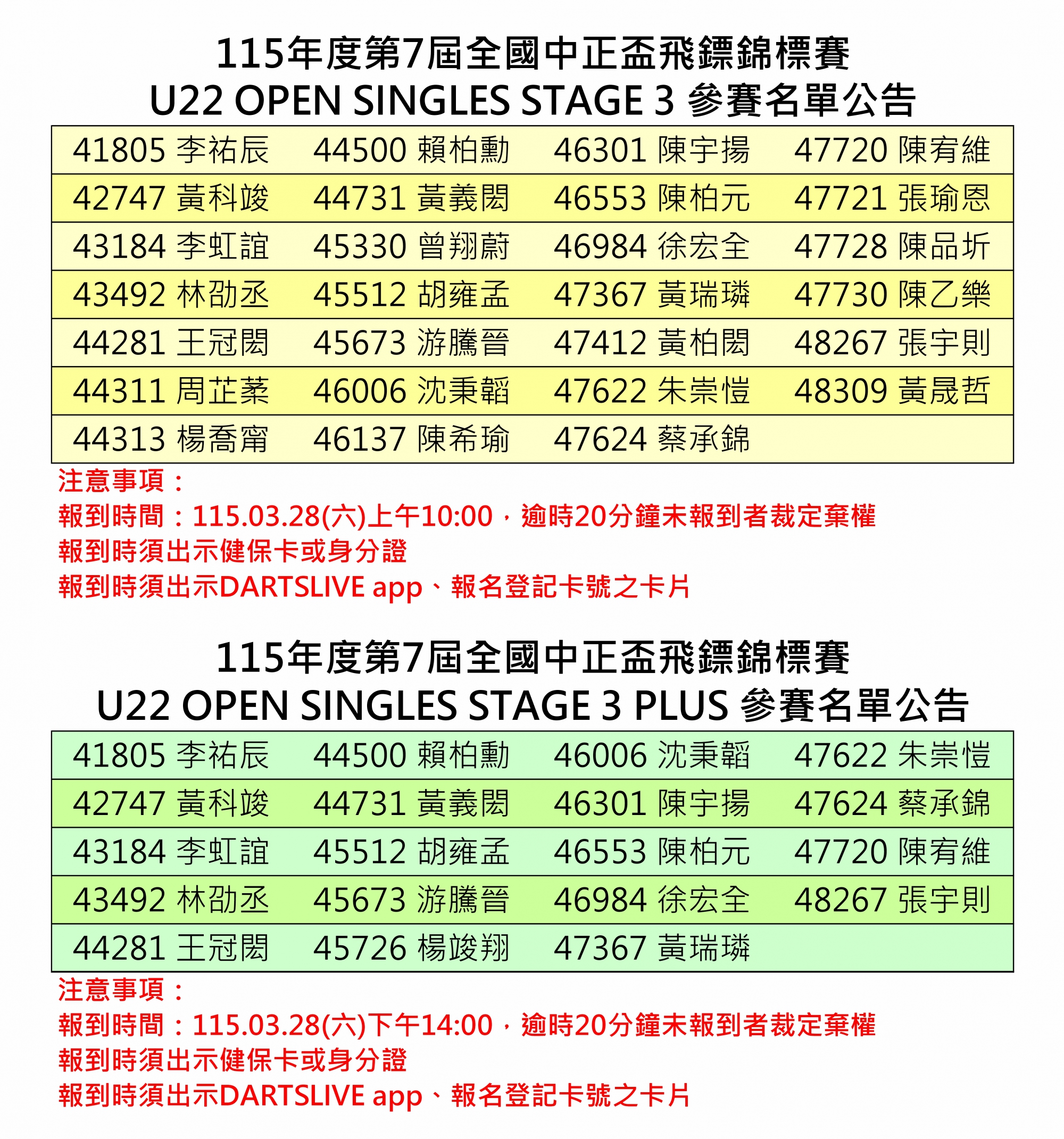 115年度第7屆全國中正盃飛鏢錦標賽 參賽名單及報到時間公告