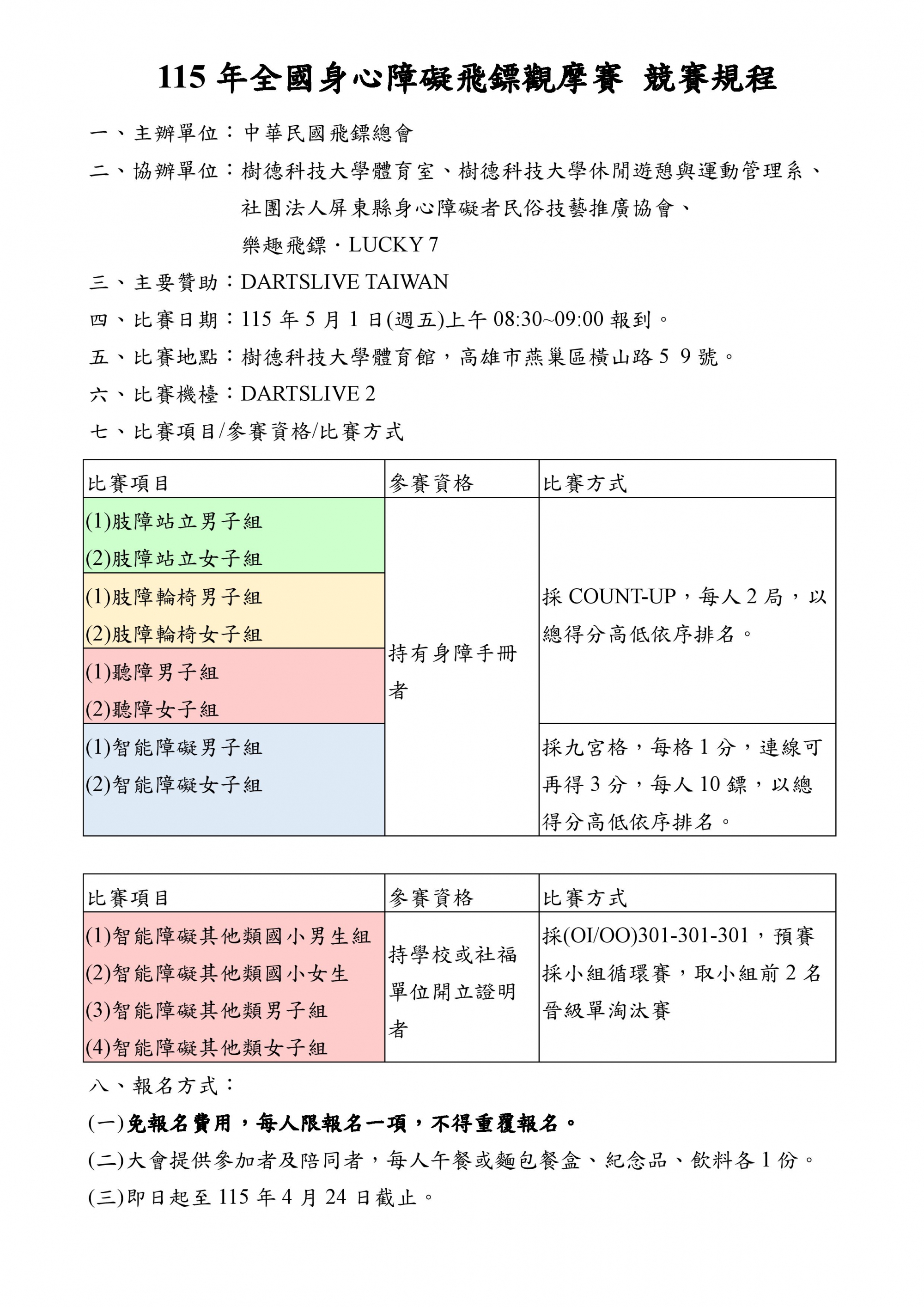 115年全國身心障礙飛鏢觀摩賽5/1樹德科技大學免報名費