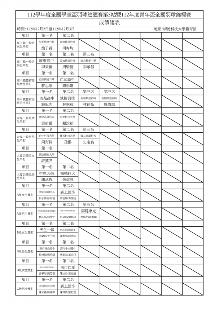 112學年度全國學童盃羽球巡迴賽第3站暨112年度青年盃全國羽球錦標賽比賽成績