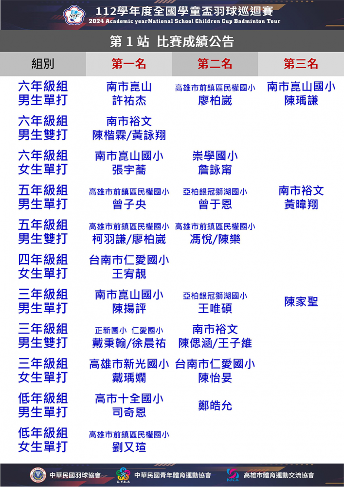 112學年度全國學童盃羽球巡迴賽第1站比賽成績