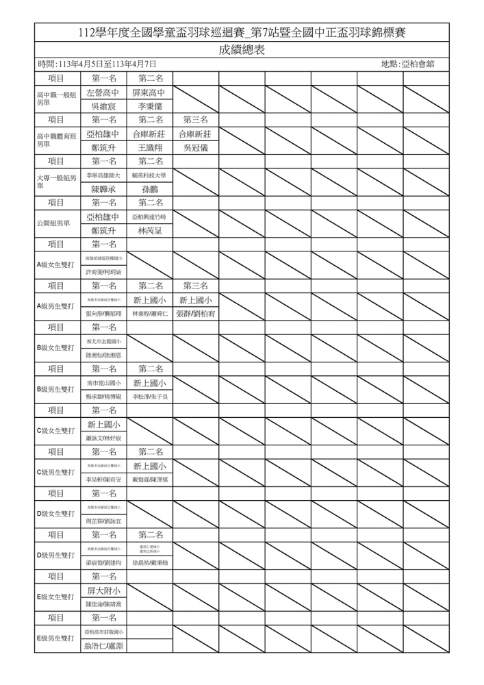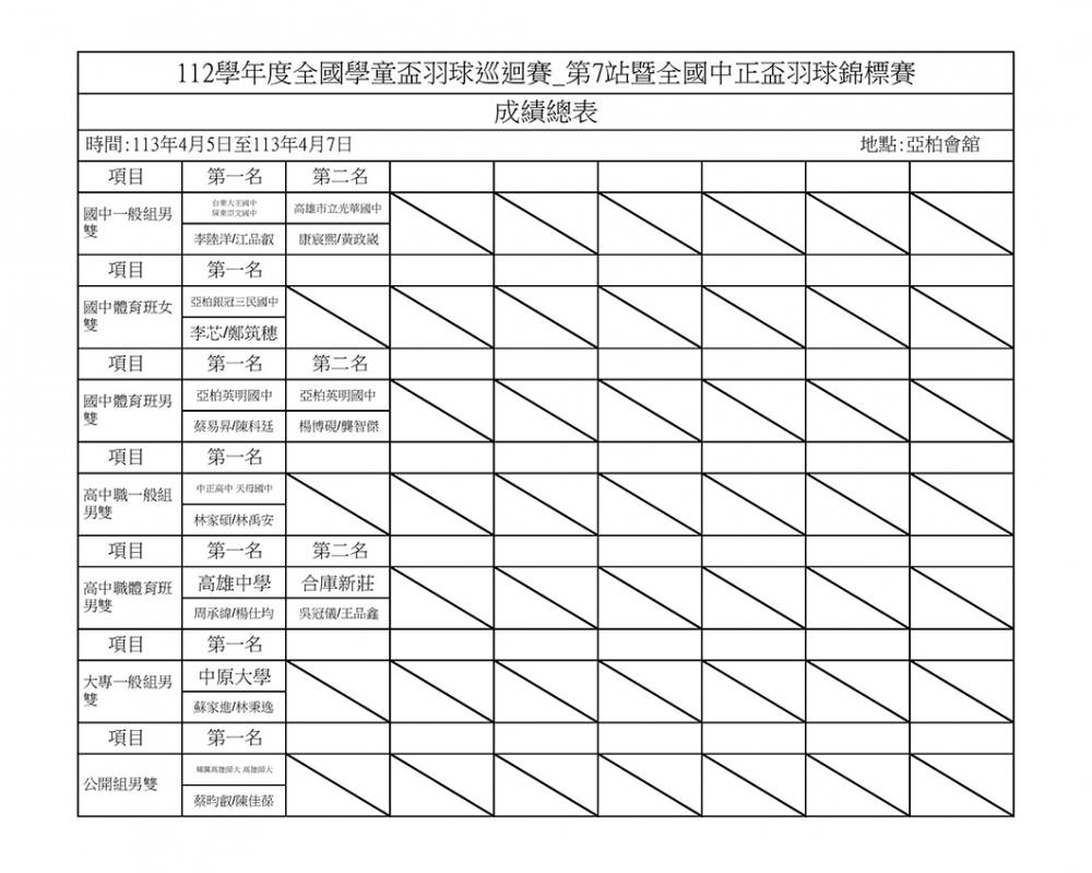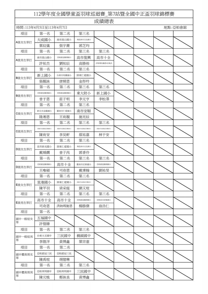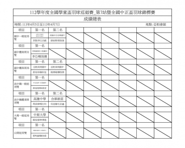112學年度全國學童盃羽球巡迴賽第7站暨113年度全國中正盃羽球錦標賽 比賽成績