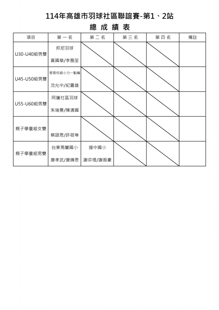 114年高雄市羽球社區聯誼賽第1、2站 比賽成績
