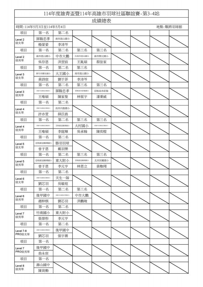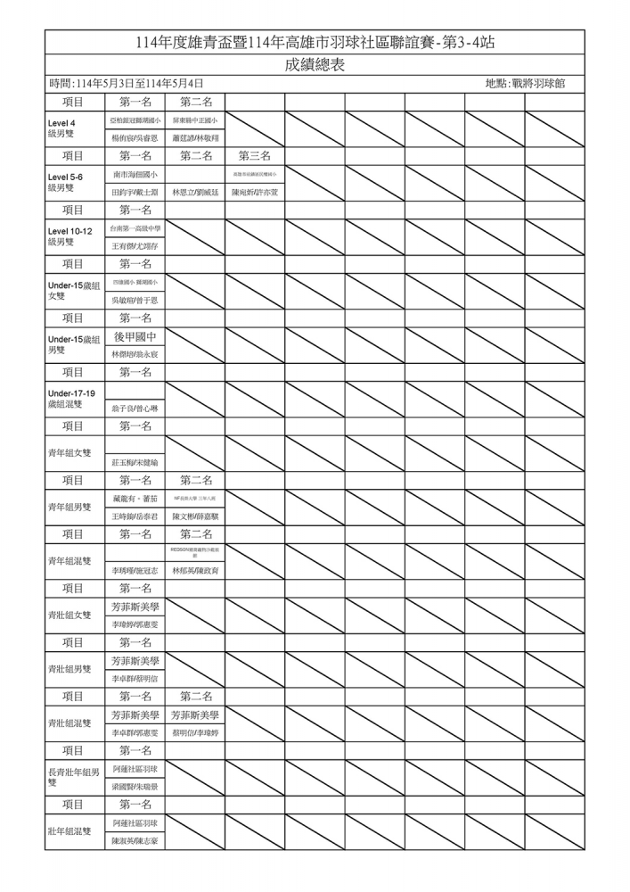 114年度雄青盃全國羽球錦標賽暨114年高雄市羽球社區聯誼賽-第3-4站比賽成績