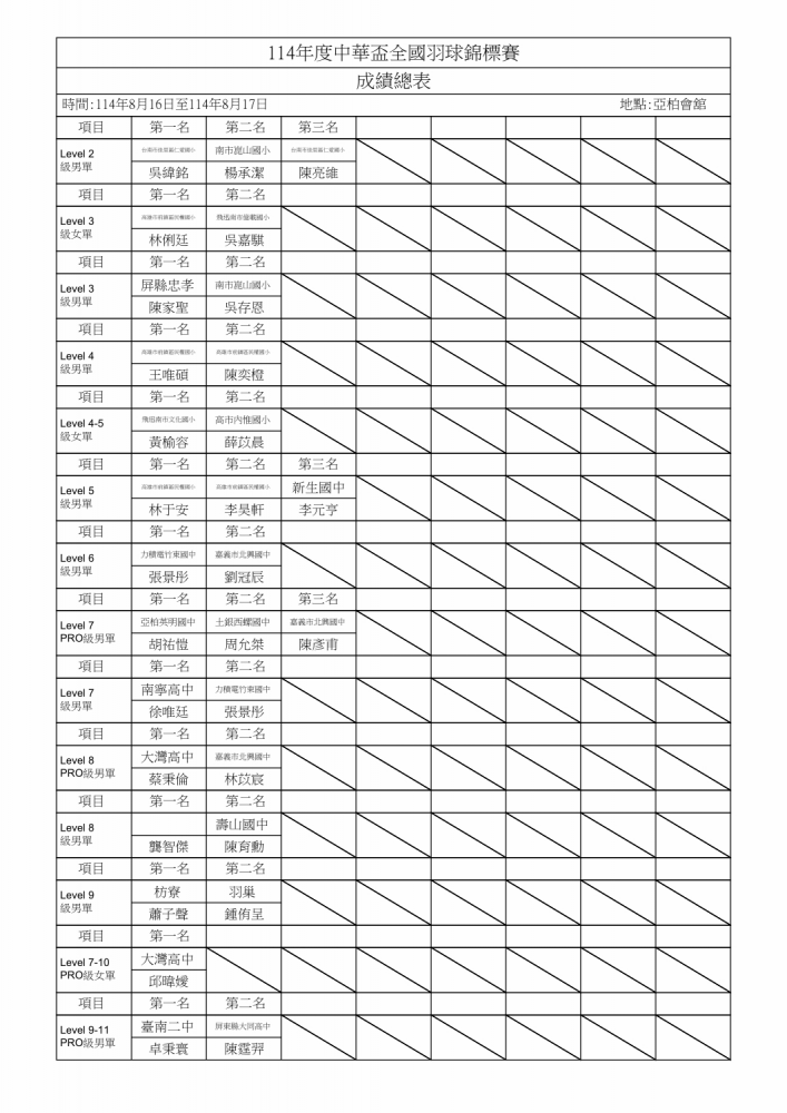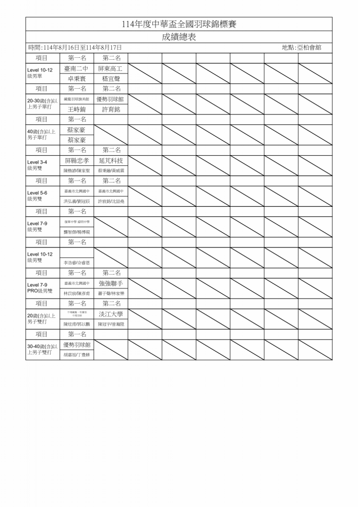 114年度中華盃全國羽球錦標賽 比賽成績