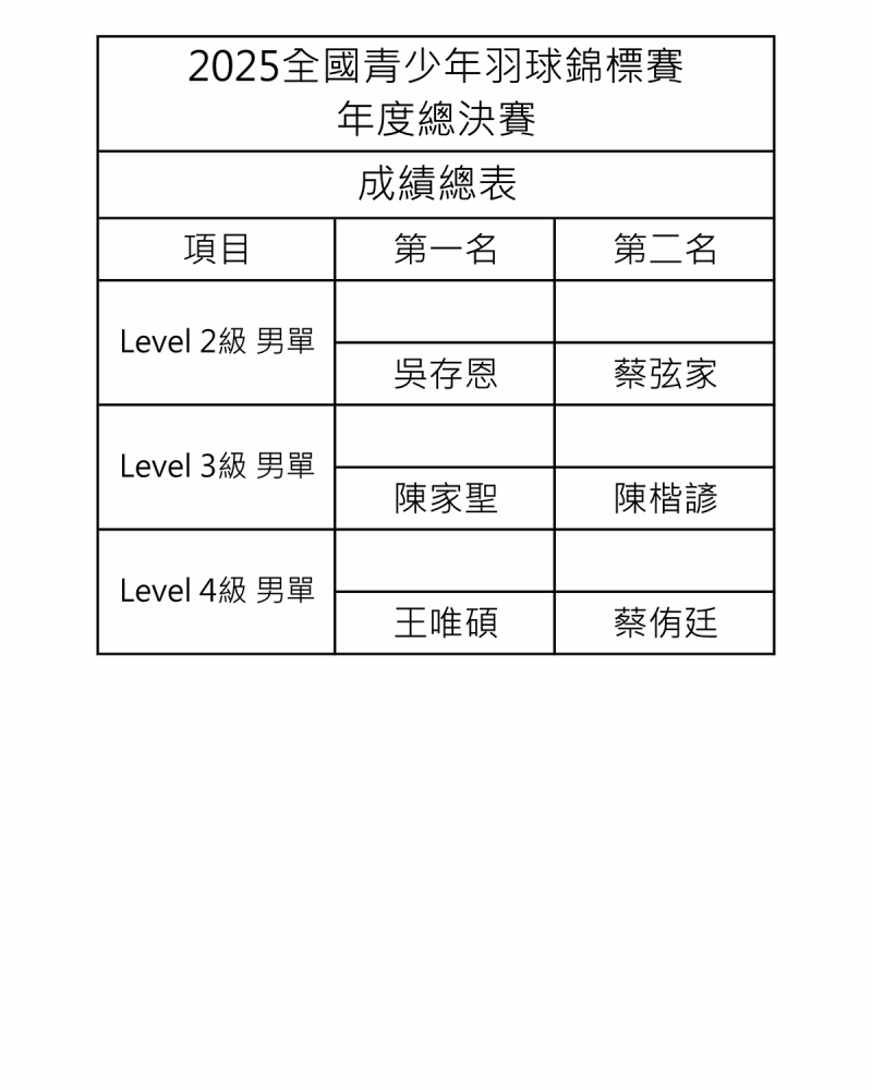 2025全國青少年羽球錦標賽年度總決賽 比賽成績