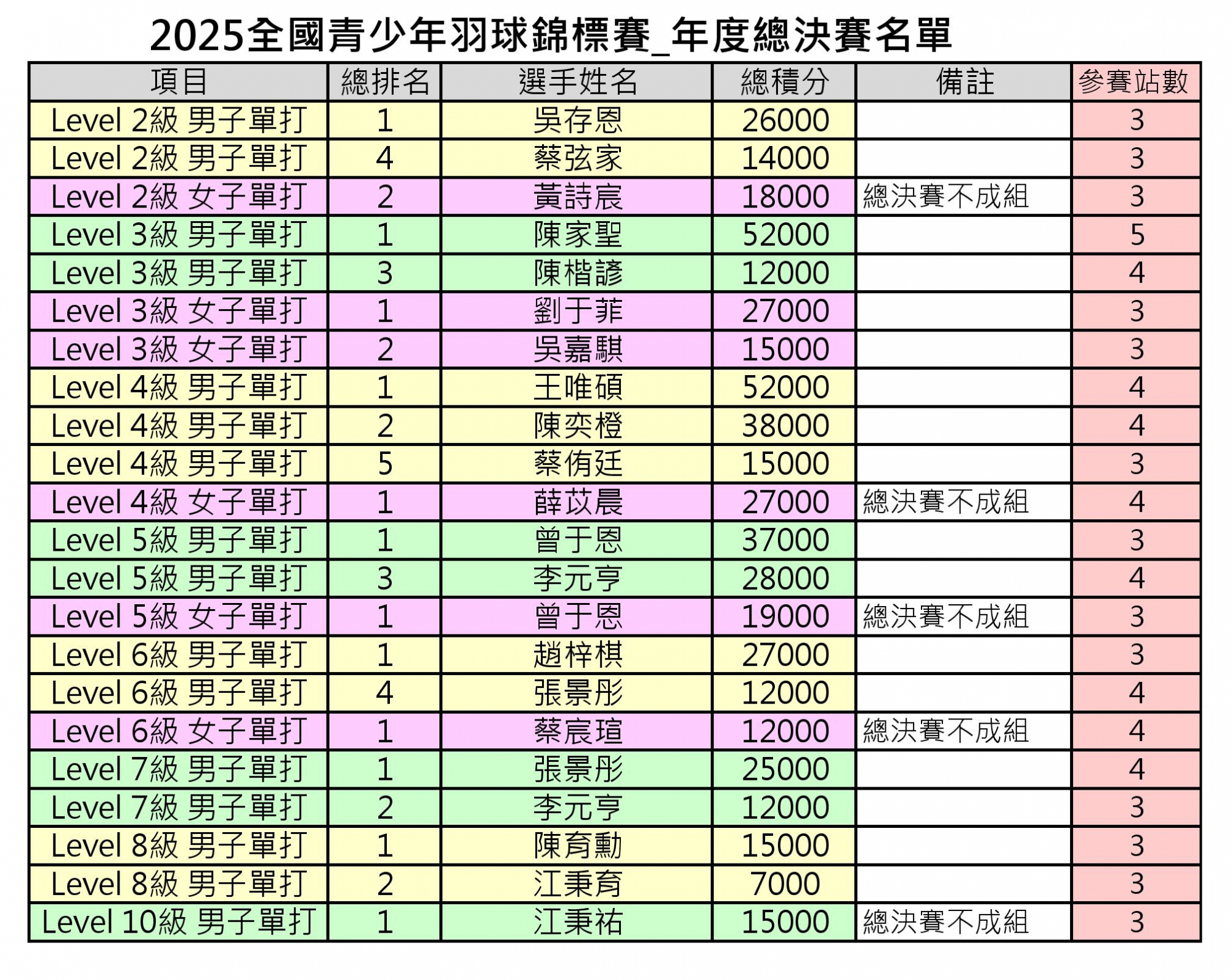 晉級2025全國青少年羽球錦標賽年度總決賽者,欲出賽者須先至本會帳戶繳交保證金500元,至報名系統填寫資料,保證金於報到後退還,未填寫者視同不出賽。〔總決賽名單https://reurl.cc/gYVMlV〕〔參賽報名網址https://reurl.cc/A3VvV3〕
