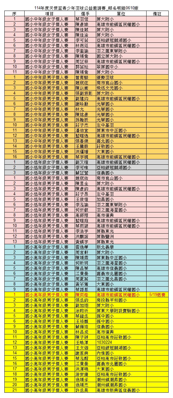 114年度天使盃青少年羽球公益邀請賽 報名成功名單