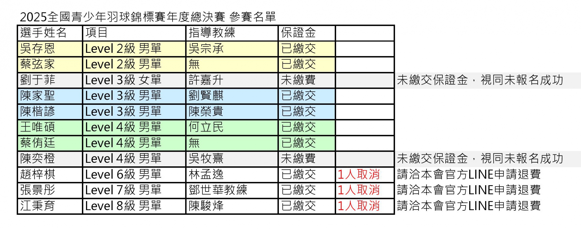 2025全國青少年羽球錦標賽年度總決賽 參賽名單公告